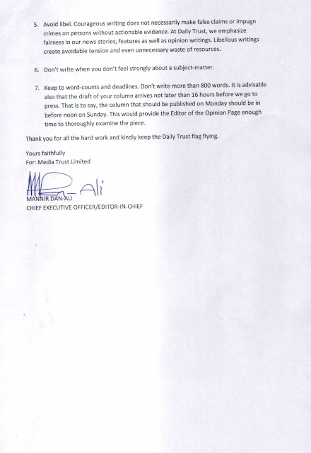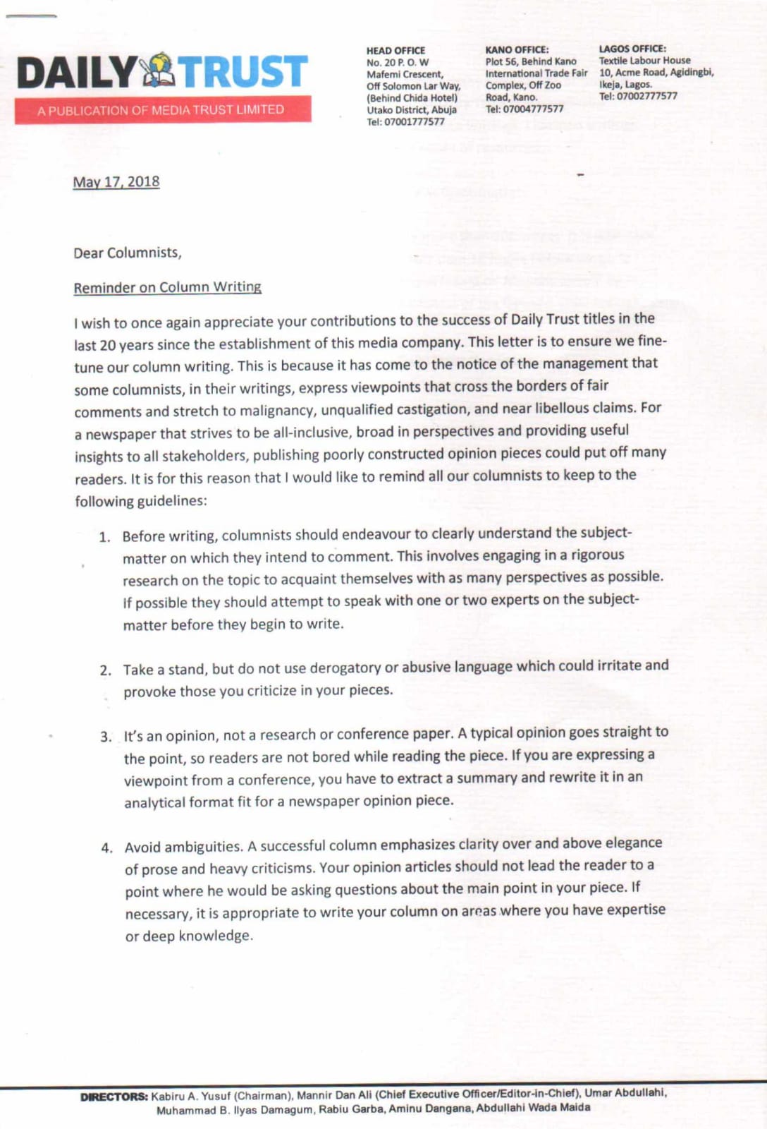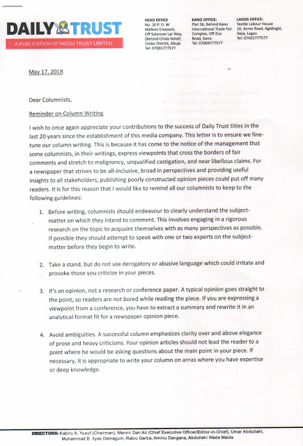 For instance, a memo I received from Daily Trust’s Editor-in-Chief on May 17, 2018 titled “Reminder on Column Writing” discouraged "elegance of prose" and "heavy criticisms" and requested columnists to not "use derogatory or abusive language which could irritate and provoke those you criticize in your pieces," among other puzzlingly barefaced attempts to police the thoughts and erase the stylistic identities of columnists.