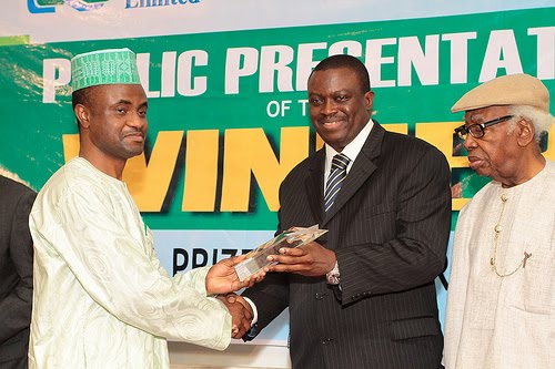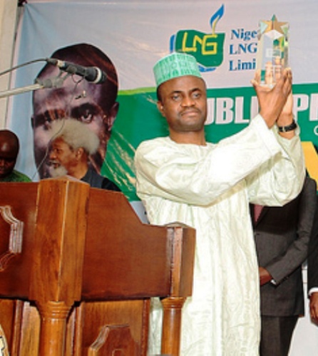 Adeleke receiving his trophy from Mr. Babs Jolayemi Omotowa, the Managing Director of the Nigeria LNG Limited.