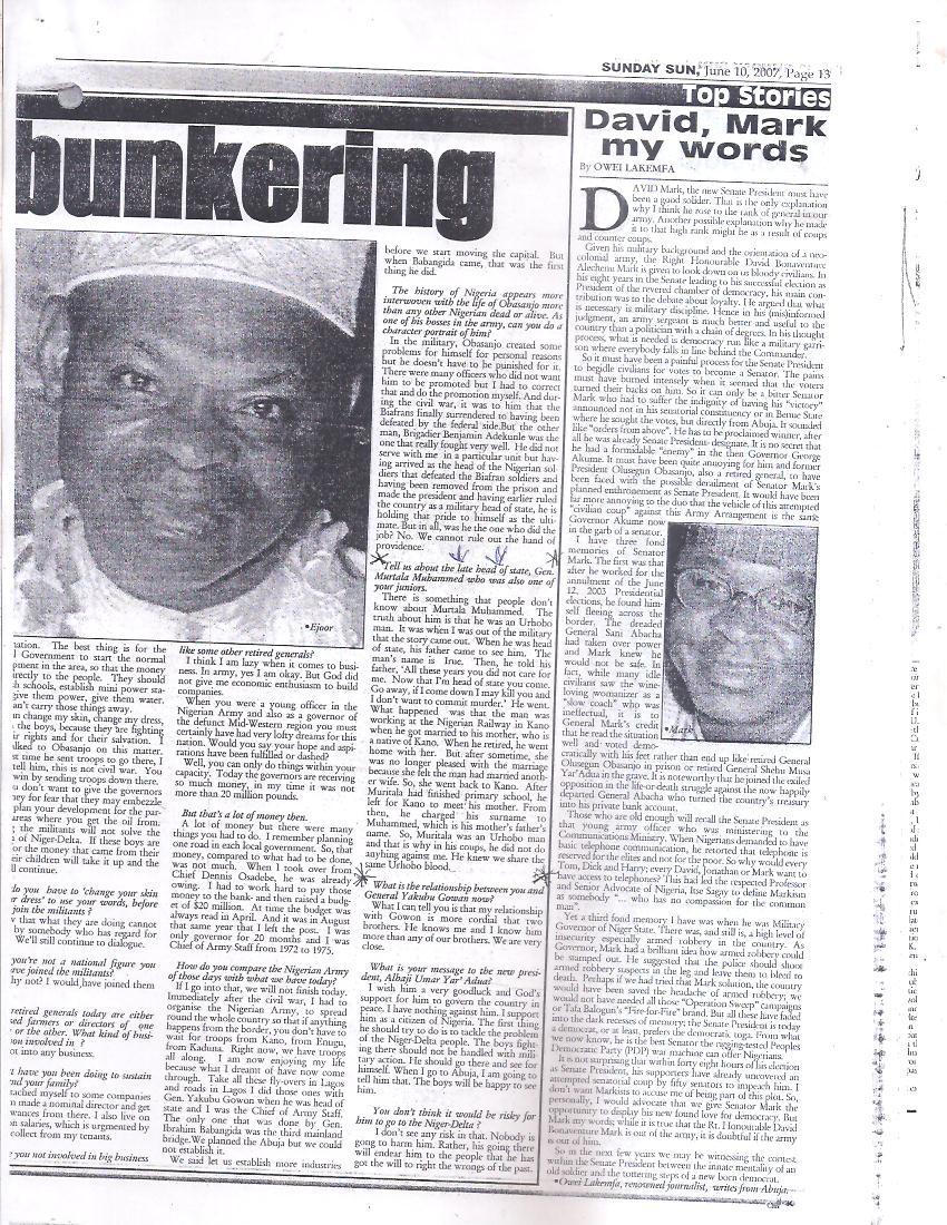 And someone sent me a scanned copy of a June 10, 2007 Sun Newspaper interview where the late Major General David Ejoor claimed on page 13 of the paper that Murtala was Urhobo on his paternal side. “When he was head of state, his father came to see him,” he claimed. “Then he told his father, ‘All these years, you did not care for me. Now that I am head of state, you come. Go away. If I come down, I will kill you and I don’t want to commit murder.”