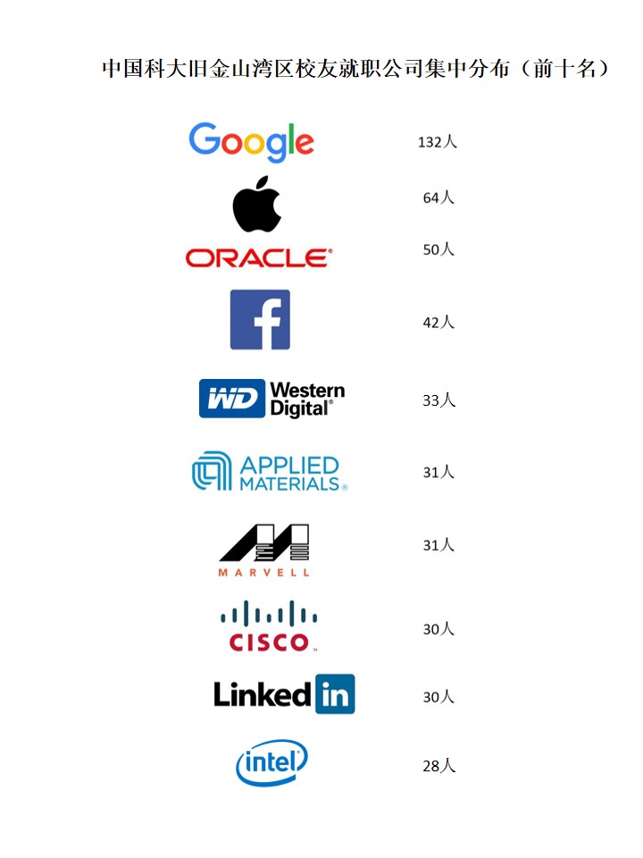 根据LinkedIn提供数据,旧金山湾区科大校友任职总人数对各大企业进行排名。Google公司有132位校友,位居第一;Apple公司64位校友,居第二。Oracle、Facebook、Stanford University、Western Digital、Applied Materials、Marvell Semiconductor、Cisco、LinkedIn分别居3-10名。(如下图所示)