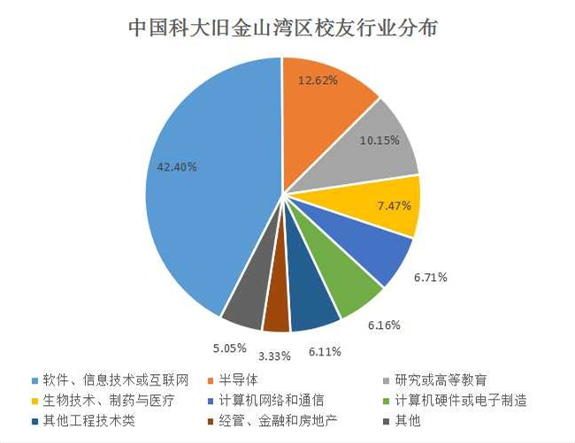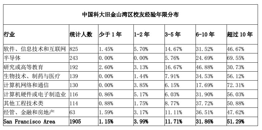 截至2016年11月17日,在LinkedIn上,旧金山湾区有1981位在美中国科大校友注册,主要分布在软件、信息技术或互联网(840名)、半导体(250名)、研究或高等教育(201名)、生物技术、制药与医疗(148名)、计算机网络和通信(133名)、计算机硬件或电子制造业(122名)、其他工程技术类(121名)、和经管、金融和房地产行业(66名)等。