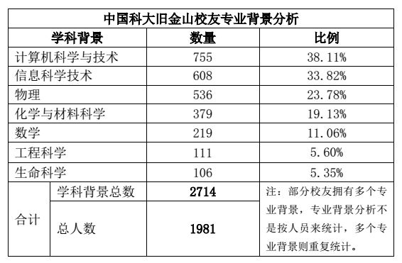 若校友拥有多个专业背景,则多个专业背景重复统计。如,1981位校友中有755人拥有计算机科学与技术背景,占校友总数的38.11%;608人拥有信息科学技术背景,占校友总数的30.69%。这两个人群可能出现重叠。从下表可以看出,具有计算机、与信息科学专业背景的校友比例居首,这与软件、信息技术、互联网行业等从业比例在该地区居高相呼应。