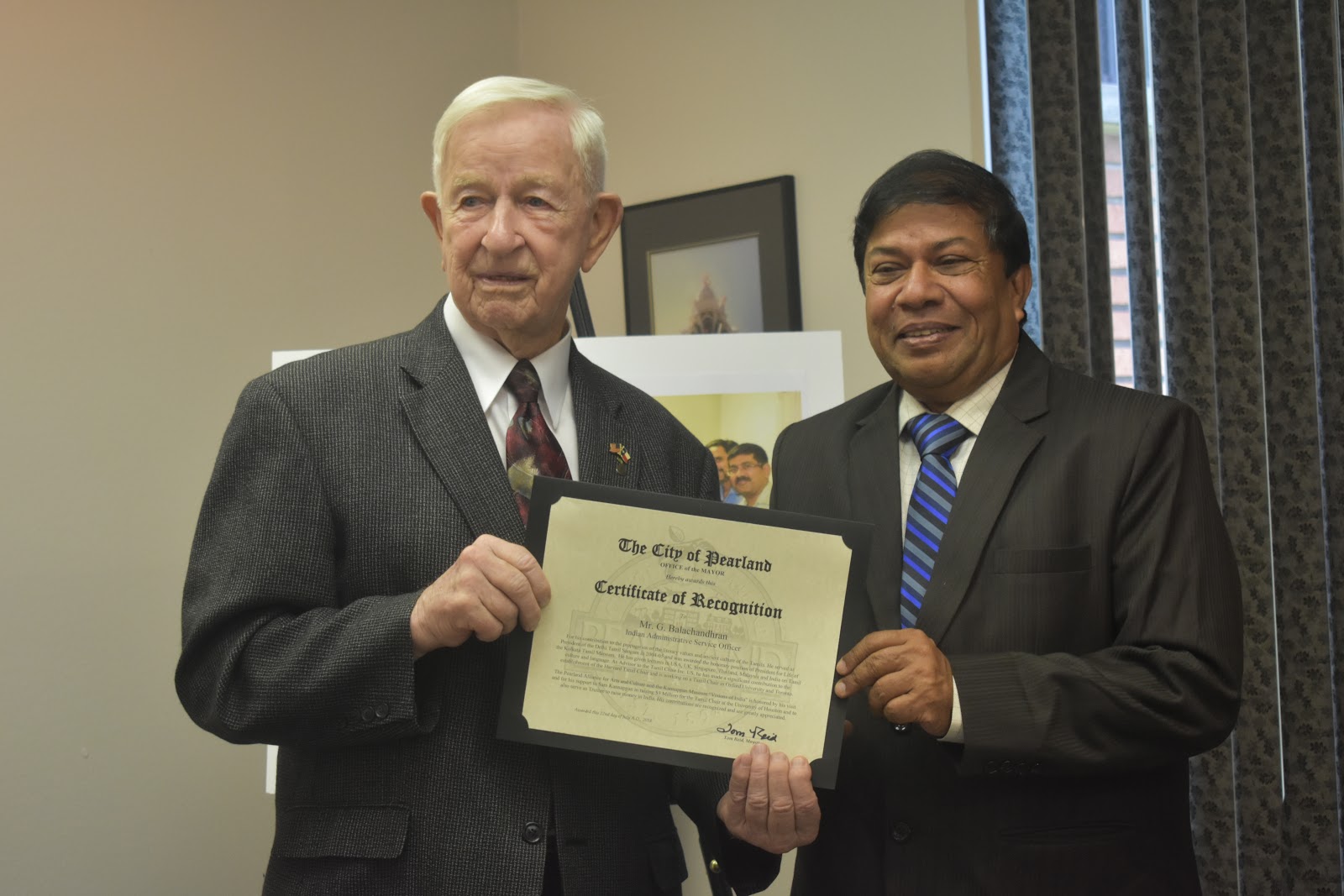 ஹூஸ்டன் பாரதி கலைமன்றத்துக்குச் சிறப்பு விருந்தினராக இந்த வாரம் திரு. பாலச்சந்திரனை அழைத்தோம். “அற்றைத் தமிழர் நோக்கும், இற்றைத் தமிழர் போக்கும்” என்ற தலைப்பில் அருமையான உரையாற்றினார். பின்னர், ஹூஸ்டன் பல்கலையில் 6 மில்லியன் $-ல் தமிழ்ப் பல்கலை அமைக்கும் பூர்வாங்கக் கூட்டத்தில் பல்கலை உயர் அதிகாரிகள், Academic Dean Dr. Tillis போன்றவர்களோடு பேசக் கலந்துகொண்டார். பியர்லாந்து நகர மேயர், டாம் ரீட் கலந்துகொண்டு பட்டயம் வழங்கிச் சிறப்பித்தார்.