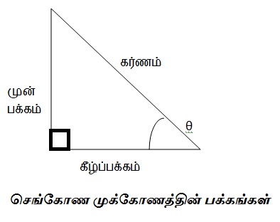 முன்பக்கம் / கர்ணம் = முகர் θகீழ்ப்பக்கம் / கர்ணம் = கீகர் θமுன்பக்கம் / கீழ்ப்பக்கம் = முகீ θ = முகர் θ / கீகர் θகர்ணம் / முன்பக்கம் = கர்மு θ = 1 / முகர் θகர்ணம் / கீழ்ப்பக்கம் = கர்கீ θ = 1 / கீகர் θகீழ்ப்பக்கம் / முன்பக்கம் = கீமு θ = 1 / முகீ θ = கீகர் θ / முகர் θமேற்காணும் தொடர்புகளைக் காணுமிடத்து, ஒரு தொடர்பினைக் குறிக்கும் பெயரில் இருந்தே அது என்ன வகையான தொடர்பு என்பதை எளிதில் அறிந்துகொள்ள முடிவதனை அறியலாம். சான்றாக, முகர் என்ற பெயரில் இருந்து அது முன்பக்கத்திற்கும் கர்ணத்திற்கும் இடையிலான தொடர்பு என்றும் முகீ என்பது முன்பக்கத்திற்கும் கீழ்ப்பக்கத்திற்கும் இடையிலான தொடர்பு என்பதனையும் எளிதில் புரிந்துகொள்ளலாம்.சில வாய்ப்பாடுகள்:1) முகர்^2θ + கீகர்^2θ = 1 ==> முகர்^2θ = 1 - கீகர்^2θ மற்றும் கீகர்^2θ = 1 - முகர்^2θ2) கர்கீ^2θ - முகீ^2θ = 13) கர்மு^2θ - கீமு^2θ = 1ஆங்கிலம் கலவாமல் இவற்றைத் தமிழில் எப்படி வாசித்துக் காட்டுவது?1) கர்மு^2θ - கீமு^2θ = 1கர்மு இருமடிக்கோண் கழித்தல் கீமு இருமடிக்கோண் சமம் ஒன்று.2) முகர்^2θ + கீகர்^2θ = 1முகர் இருமடிக்கோண் கூட்டல் கீகர் இருமடிக்கோண் சமம் ஒன்று.3) கர்கீ^2θ - முகீ^2θ = 1கர்கீ இருமடிக்கோண் கழித்தல் முகீ இருமடிக்கோண் சமம் ஒன்று.சான்றாக ஒரு முக்கோணவியல் கணக்கினை தமிழ்முறைப்படி எழுதி நிறுவலாம்.முகீ θ + கர்கீ θ - 1 1 + முகர் θ----------------------------------- = ------------------------முகீ θ - கர்கீ θ + 1 கீகர் θஇடப்புறம் = முகீ θ + கர்கீ θ -1-------------------------------முகீ θ - கர்கீ θ +1= முகீ θ + கர்கீ θ - ( கர்கீ^2θ - முகீ^2θ )--------------------------------------------------------------முகீ θ - கர்கீ θ + 1= முகீ θ + கர்கீ θ - ( கர்கீ θ + முகீ θ ) ( கர்கீ θ - முகீ θ)-------------------------------------------------------------------------------------------முகீ θ - கர்கீ θ + 1= முகீ θ + கர்கீ θ ( 1 - ( கர்கீ θ - முகீ θ) )---------------------------------------------------------------------முகீ θ - கர்கீ θ + 1= முகீ θ + கர்கீ θ ( 1 - கர்கீ θ + முகீ θ )---------------------------------------------------------------------முகீ θ - கர்கீ θ + 1= முகீ θ + கர்கீ θ= (முகர் θ / கீகர் θ) + (1 / கீகர் θ)= 1 + முகர் θ---------------------கீகர் θ= வலப்புறம்அளவியல் வாய்ப்பாடுகள்:அளவியல் வாய்ப்பாடுகளில் கூட ஆங்கில எழுத்துக்களையே பயன்படுத்துகின்றனர். இந்த வாய்ப்பாடுகளை எல்லாம் மிக அழகாகத் தமிழில் சுருக்கமாகக் கீழ்க்காணுமாறு குறிப்பிடலாம். நீளம் - நீ என்றும், அகலம் - அ என்றும், உயரம் - உ என்றும், கீழ்ப்பக்கம் - கீ என்றும் ஆரம் - ஆ என்றும் விட்டம் - வி என்றும் 22/7 என்ற மதிப்புடைய 'பை' யினை 'பை' என்றும் குறிப்பிடலாம். பரப்பளவினைப் ப என்றும் சுற்றளவினைச் சு என்றும் கனஅளவினைக் க என்றும் சுருக்கமாகக் குறிப்பிடலாம். சான்றாக,சதுரத்தின் பரப்பளவு, பச = நீ^2செவ்வகத்தின் பரப்பளவு, பசெ = நீ*அவட்டத்தின் பரப்பளவு, பவ = பை*ஆ^2முக்கோணத்தின் பரப்பளவு, பமு = (கீ*உ)/2சதுரத்தின் சுற்றளவு, சுச = 4.நீசெவ்வகத்தின் சுற்றளவு, சுசெ = 2.(நீ+அ) = 2.நீ + 2.அவட