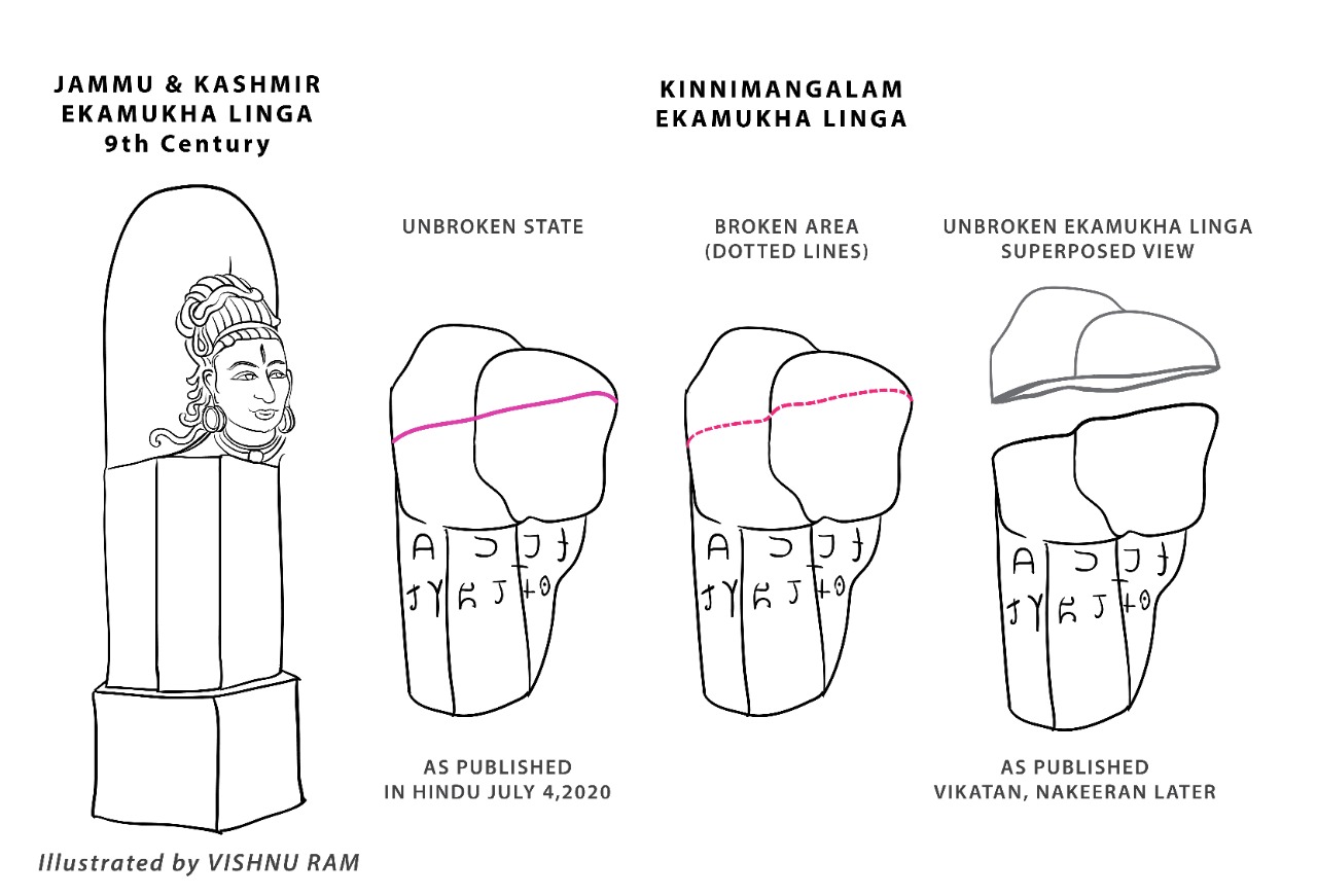 உச்சி முதலில் இருந்த நிலை: (Kinnimangalam Ekamukha Linga with top intact when found).