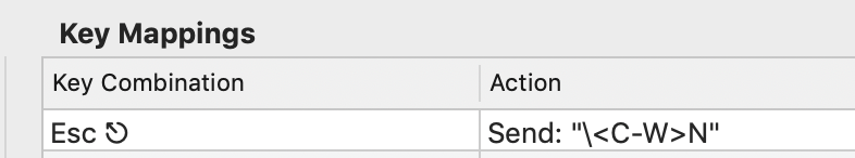 tnoremap <Esc> <C-W>N tnoremap <Esc><Esc> <C-W>N set timeout timeoutlen=1000 " Default set ttimeout ttimeoutlen=100 " Set by defaults.vim