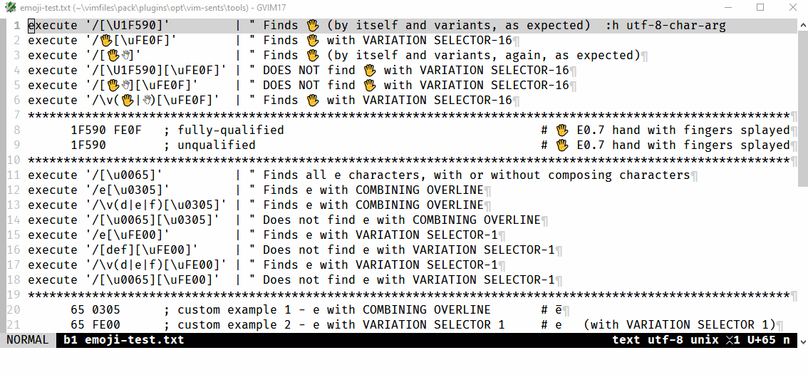 This does work, and could be extended to work for 100+ emoji that may have a combining VARIATION SELECTOR-16. But including those literally in that first parenthetical grouping seems really inefficient and inconvenient. More importantly, it would be impossible to account for any character that has a variation selector because then you would need tens of thousands of literal characters in that first parenthetical group. The consequence of that is any global replace on characters where they have a variation selector of any form will "break" the combined character, e.g., %sm_\([\U10000-\U10ffff]\)_\=printf("\\U%08x", char2nr(submatch(0)))_g would be fine for substituting non-combined Unicode characters between U+10000 and U+10FFFF but would remove/delete any combining character altogether.