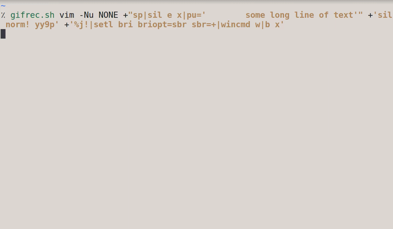 $ vim -Nu NONE +"sp|sil e x|pu='        some long line of text'" +'sil norm! yy9p' +'%j!|setl bri briopt=sbr sbr=+|wincmd w|b x'