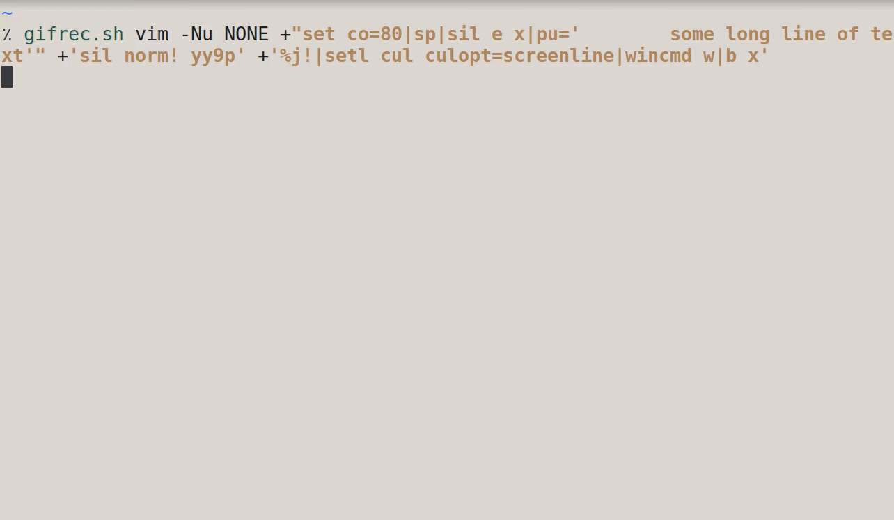 $ vim -Nu NONE +"set co=80|sp|sil e x|pu='        some long line of text'" +'sil norm! yy9p' +'%j!|setl cul culopt=screenline|wincmd w|b x'