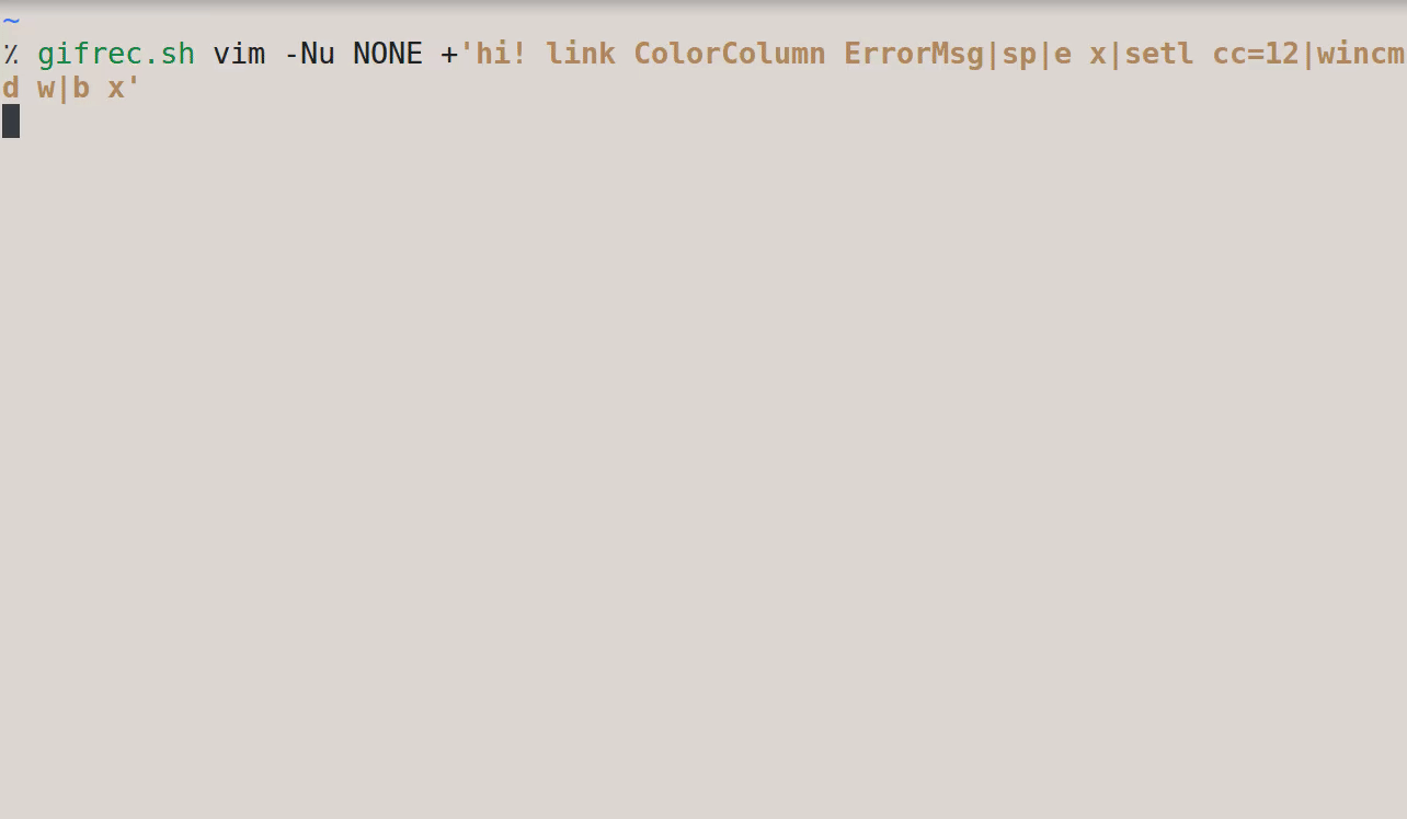 > $ vim -Nu NONE +'sp|e x|setl cc=12|wincmd w|b x'