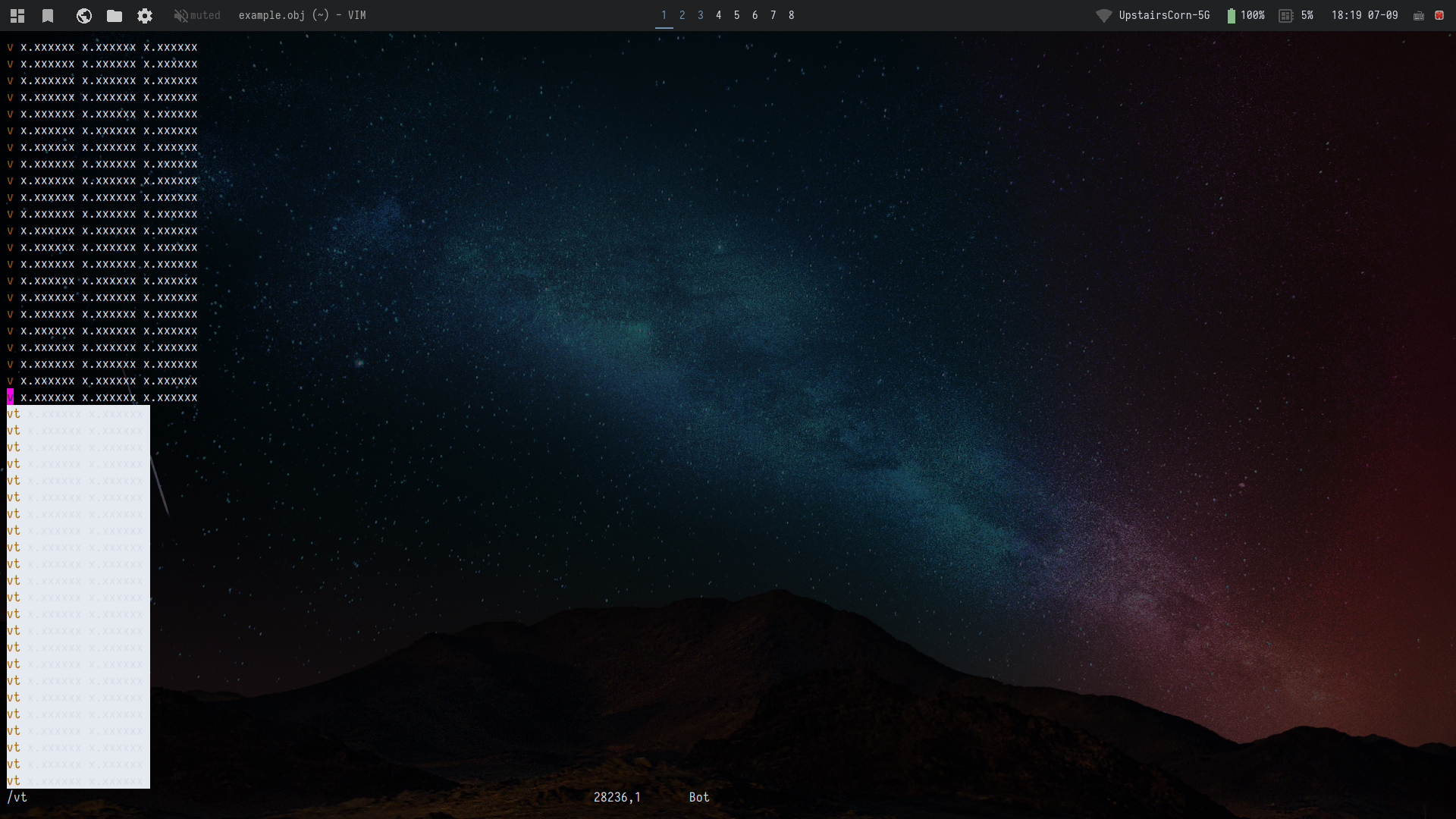 I was using visual-line to select lines in this file in a weird way and vim froze. I couldn't scroll or open another file.