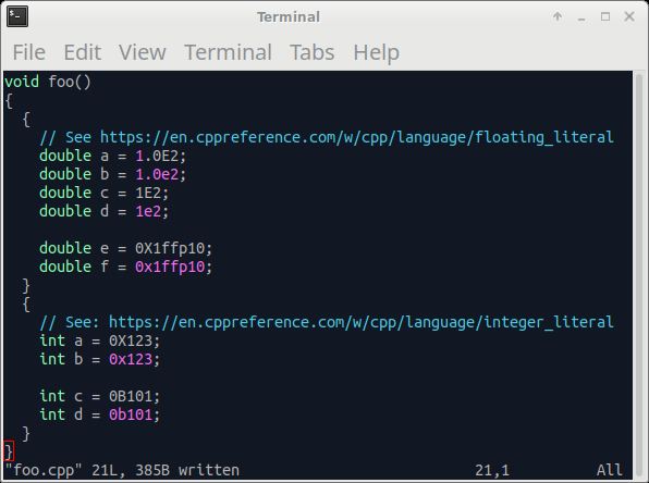 This PR fixes syntax highlighting of C++ floating point and integer literals, which were not properly highlighted as illustrated in the screenshot below: