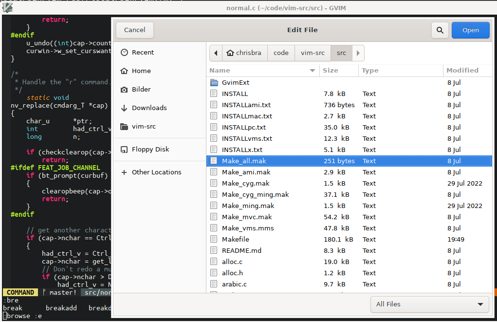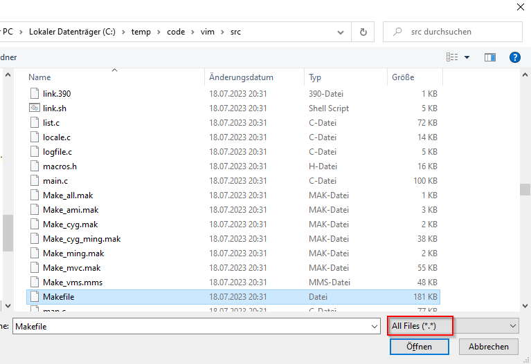 Note that in the list of file types to show, All Files is given as (.). This means that files with no extension, such as Makefile, are not shown.