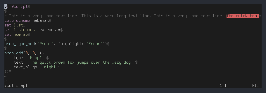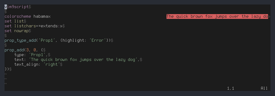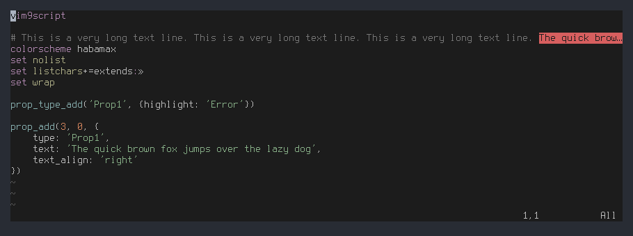 vim9script colorscheme habamax set list set listchars+=extends:» set nowrap prop_type_add('Prop1', {highlight: 'Error'}) prop_add(3, 0, { type: 'Prop1', text: 'The quick brown fox jumps over the lazy dog', text_align: 'right' })