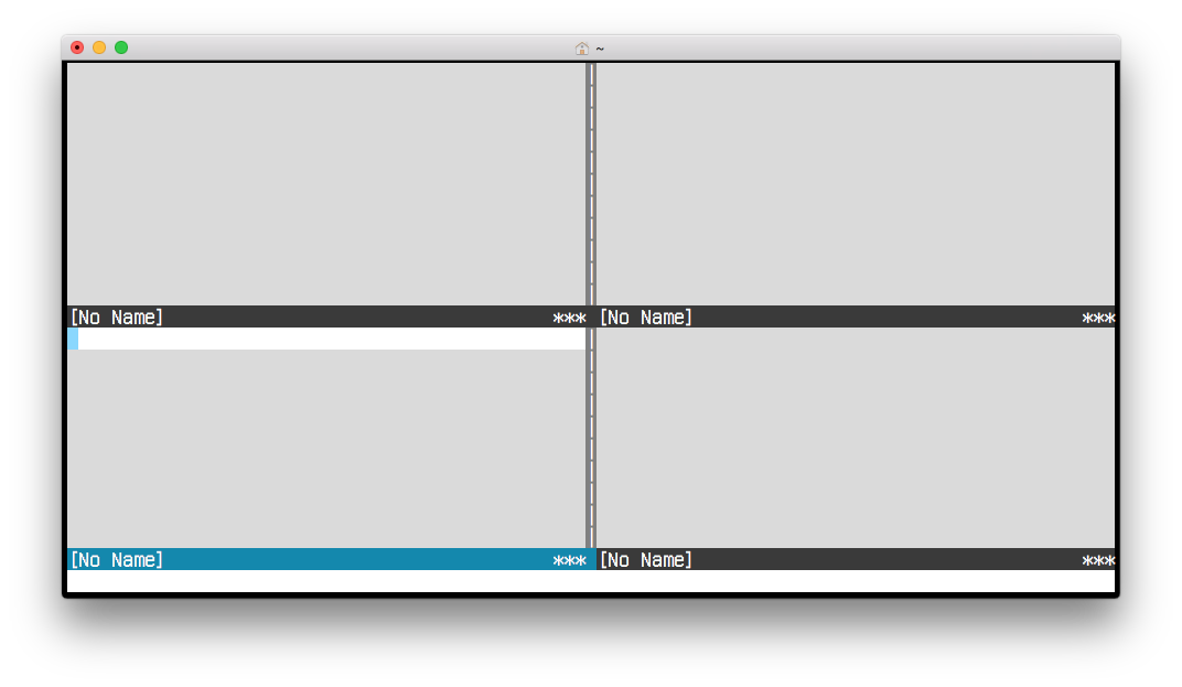 Now start vim, but this time first do a horizontal split, and then split each window vertically: vim -c "sp | vsp | wincmd j | vsp". The result looks like this: