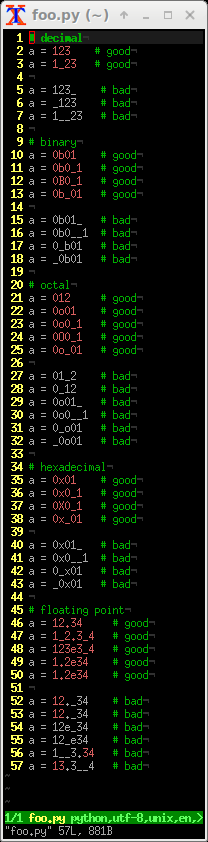 > @@ -156,18 +156,25 @@ syn match pythonEscape "\\$" " " and so on, as specified in the 'Python Language Reference'. " https://docs.python.org/reference/lexical_analysis.html#numeric-literals +"