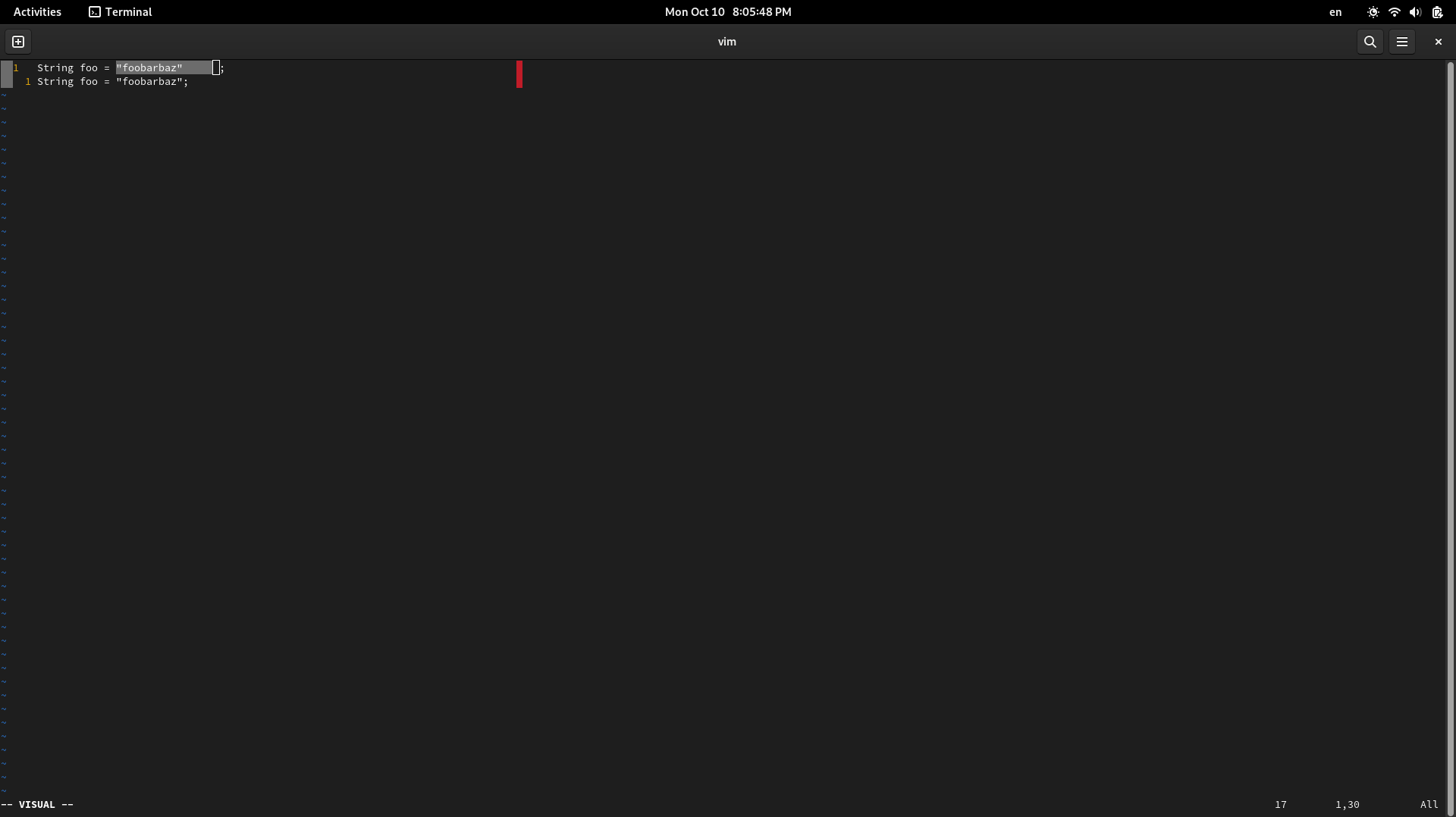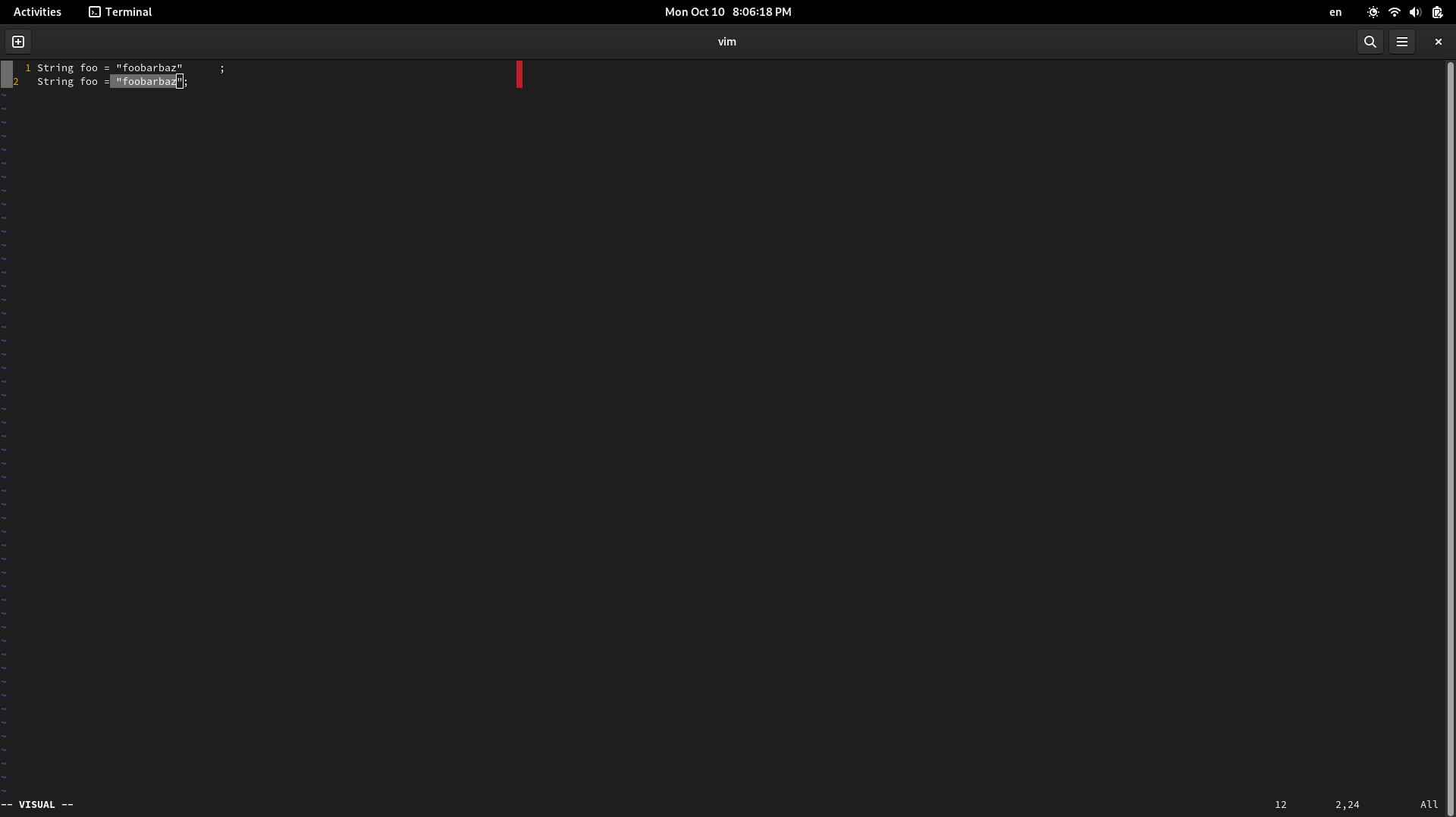 String foo = "foobarbaz" ;foobarbaz, and then type va"String foo = "foobarbaz";foobarbaz, and then type va".In the first example, I expect only "foobarbaz" to be highlighted. However, the trailing whitespace between the " and ; is also highlighted.