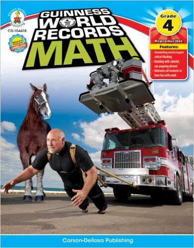 For math, I found the Guinness World Records Math 4th Grade (affiliate link for CBD) workbook for $4 on clearance at Staples. Each page spread has information and pictures about a world record, which is often science related, so it is cross-curricular. Then the student figures out several word problems using the data in the article. In the first lesson, we did multi-digit subtraction with regrouping, multiplying by 10, rounding, and creating a table, all based on animal eyesight records. This is a practical application supplement to our regular math workbook.