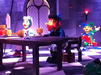 with the trademark colorful plastic flags, a Lego gargoyle, and Lego soldier. During the preliminary inside segment, you