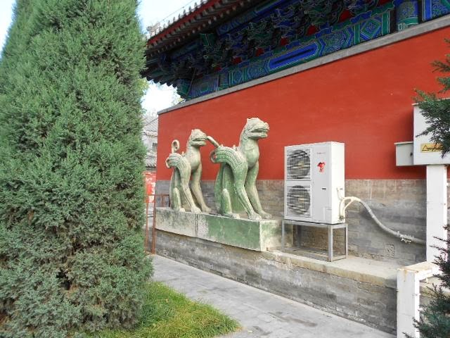 The azure heavens with the celadon and golden ceramics that adorn the tomato soup red stone gate made for a gorgeous picture. "Gnarled cypress trees outside the gate create thick shade from the sun. On each side of the gate stands a huge marble stele inscribed in Mandarin and Mongolian ordering all horse riders, even the emperor, to dismount. The glazed yellow tiles on the roof reveal the temple’s past dignity." (from CITS)