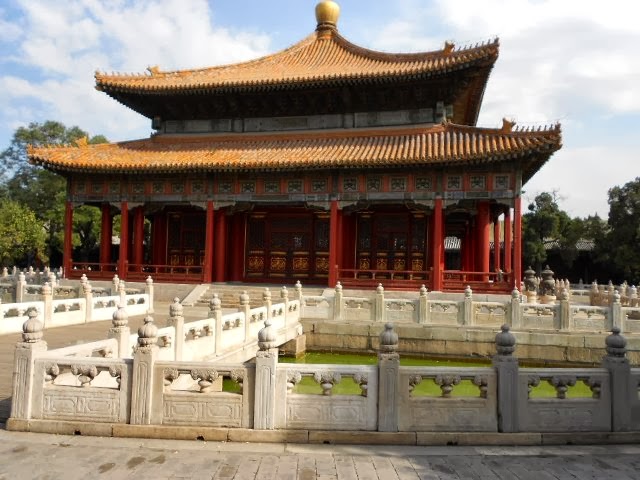 West of the Confucius Temple is the Imperial College (国子监; Guózǐjiàn), where the emperor expounded the Confucian classics to an audience of thousands of kneeling students, professors and court officials – an annual rite. Built by the grandson of Kublai Khan in 1306, the former college was the supreme academy during the Yuan, Ming and Qing dynasties. On the site is a marvellous [sic] glazed, three-gate, single-eaved decorative archway. The Bìyōng Hall beyond is a twin-roofed structure with yellow tiles surrounded by a moat and topped with a shimmering gold knob.
