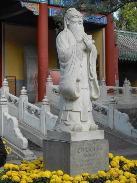 Another statue of the great sage, Kongzi (孔子), fenced in with the red-ribbons of good wishes |