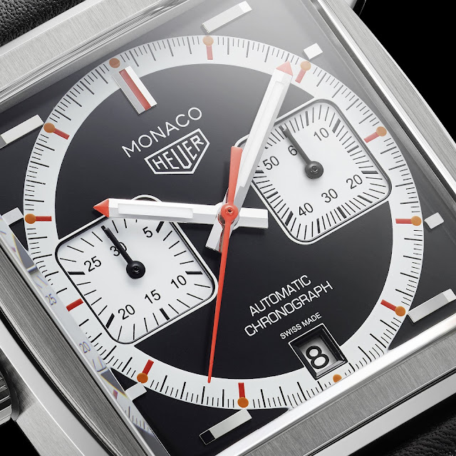 La réplique de la montre TAG Heuer Monaco en édition limitée CAW211Y.FC6469 affiche l'heure via les aiguilles des heures et des minutes montées au centre et un sous-cadran des secondes à 3 heures. La fonction chronographe peut enregistrer le temps sur demande à l'aide d'une aiguille centrale des secondes et d'un registre de 30 minutes à 9 heures. La date chevauche la frontière entre la base noire du cadran et la bague des minutes blanche qui délimite les sous-cadrans carrés doux.