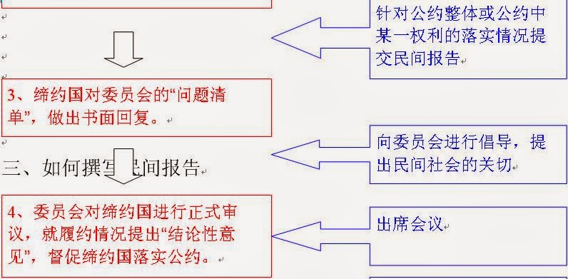 民间社会可以向委员会提交有关中国政府落实该公约情况的报告,监督中国政府更好地落实它所承诺的国际公约,撰写民间报告除了参考委员会问题清单之外,最好也能参阅下面一些文件: