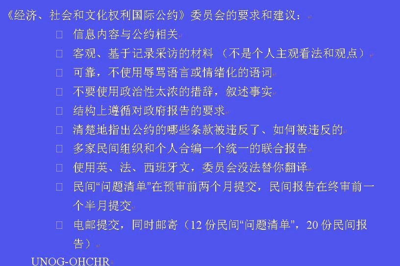 3、民间团体可以就委员会“问题清单”里面的某一个或几个具体问题,进行独立调查、收集可靠数据和核实有关事实,然后将调查结果在审议之前提交委员会。民间团体也可以联合向委员会提交关于经社文权利的专题性或全面性的报告。