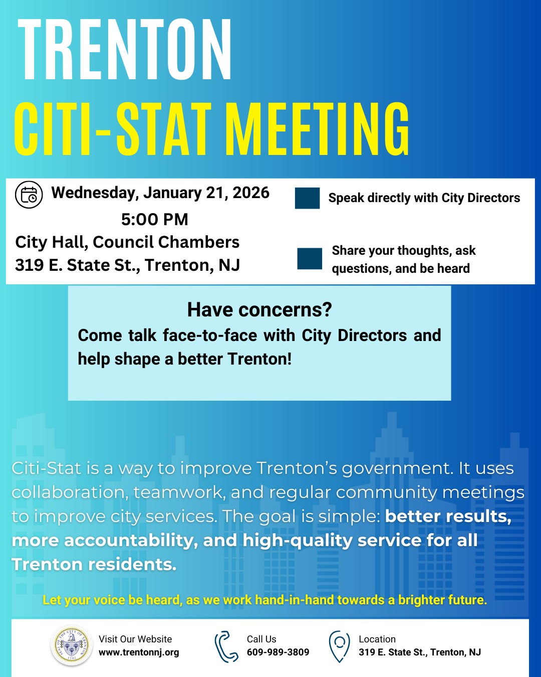 CITI-STAT - City of Trenton. [Wednesday, January 21, 5pm] City Hall, Council Chambers, 319 East State Street, Trenton. Have concerns? Come talk face-to-face with City Directors and help shape a better Trenton! See the Flier