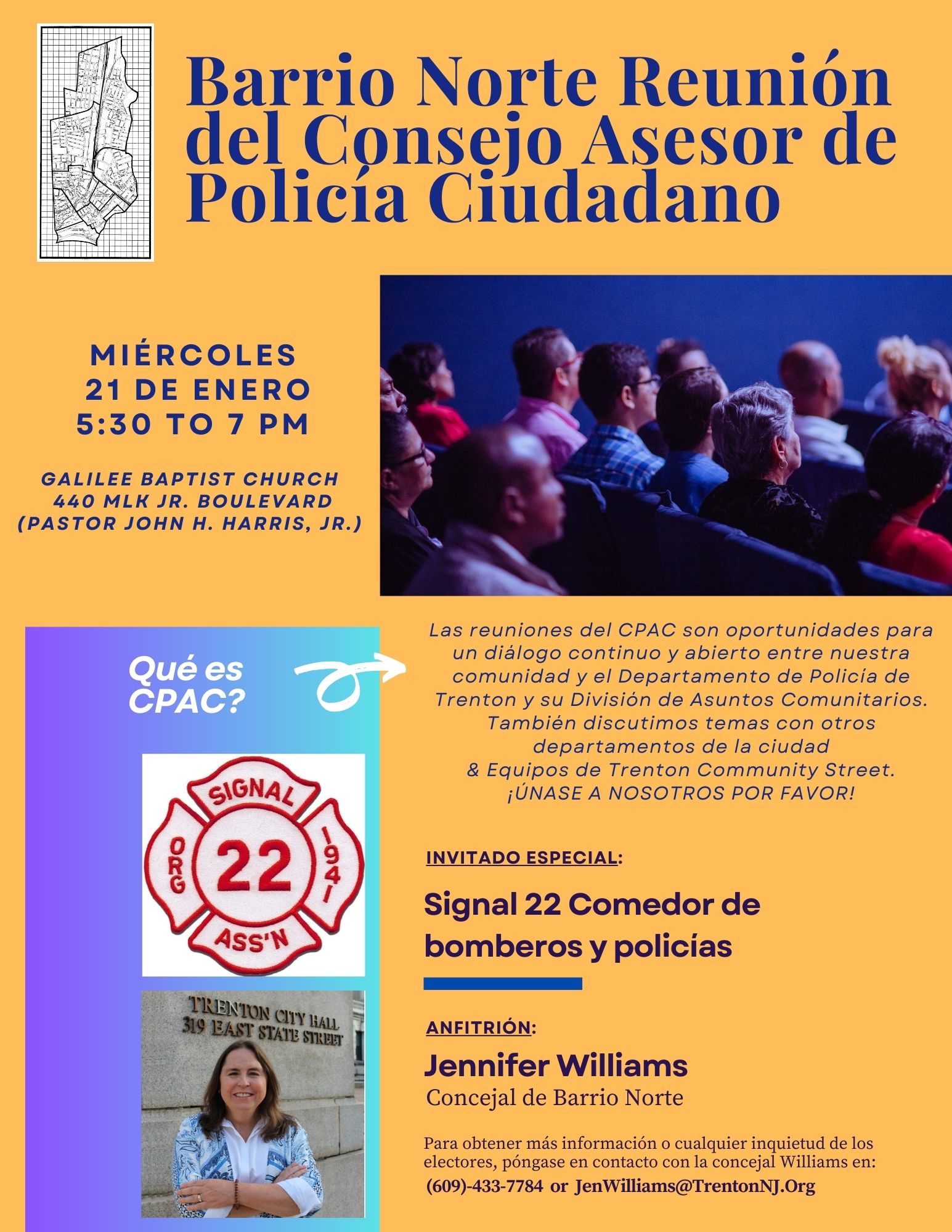 North Ward CPAC (Citizens Police Advisory Council) / Barrio Borte Reunión del Consejo Asesor de Policía Ciudadano - City Council Vice President, Jennifer Williams. [Wednesday / Miércoles, 21 de enero, 5:30-7pm] Galilee Baptist Church, 440 MLK Jr. Boulevard. Special Guest: Signal 22 Fire & Police Canteen / Comedor de bomberos y policias. See the Flier: in English en español