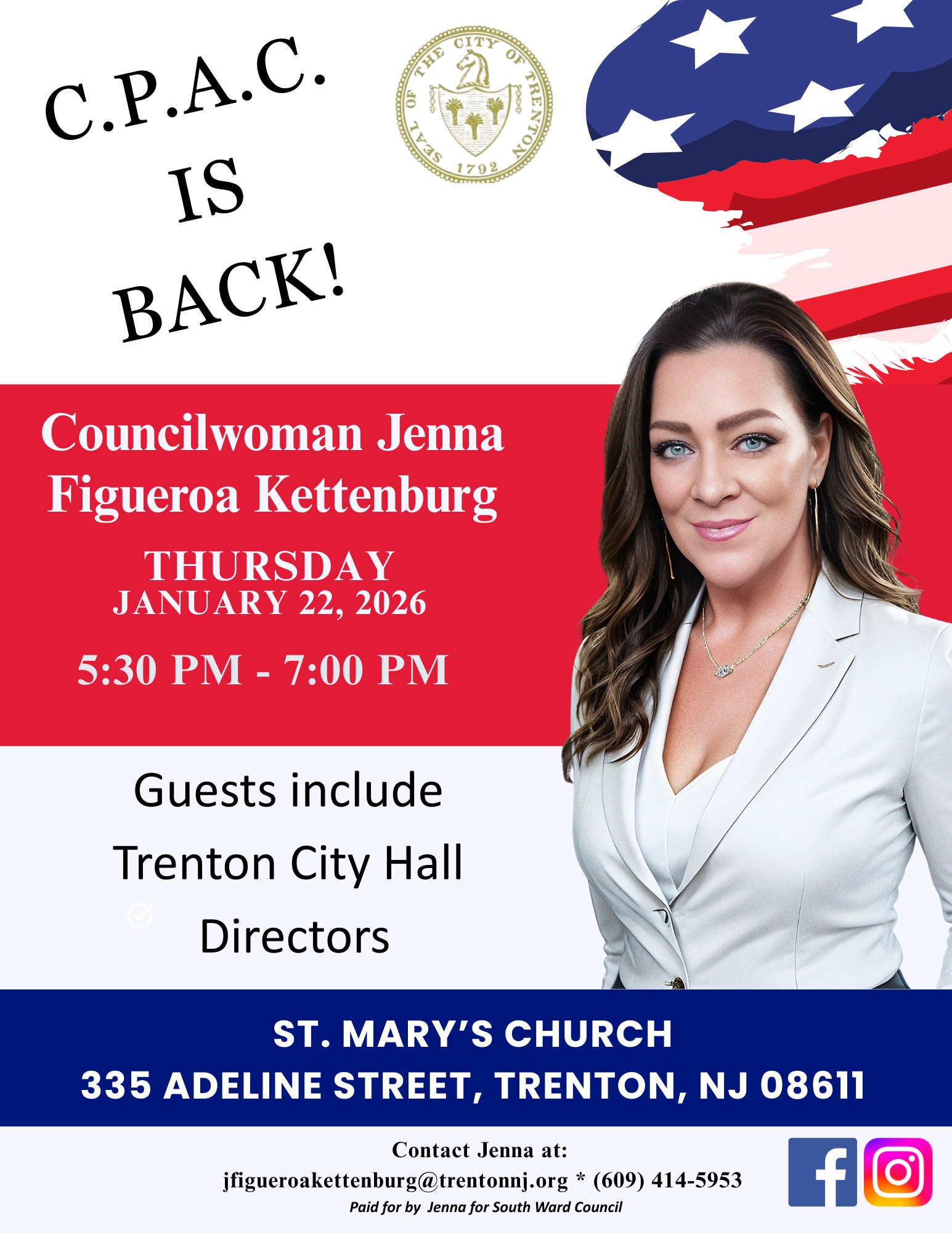 South Ward CPAC with Council President Jenna Figueroa Kettenburg. [Thursday, January 22, 5:30-7pm] St. Mary's Church, 335 Adeline Street, Trenton. Guest include City Hall Department Directors. See the Flier. See the Flier