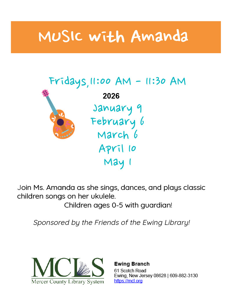 Music with Amanda - for children 0-5 with guardian. [Friday, February 6, 11-11:30am] Mercer County Library System, Ewing Branch, 61 Scotch Road, Ewing. Join Ms. Amanda as she sings, dances, and plays classic children songs on her ukulele. See the Flier