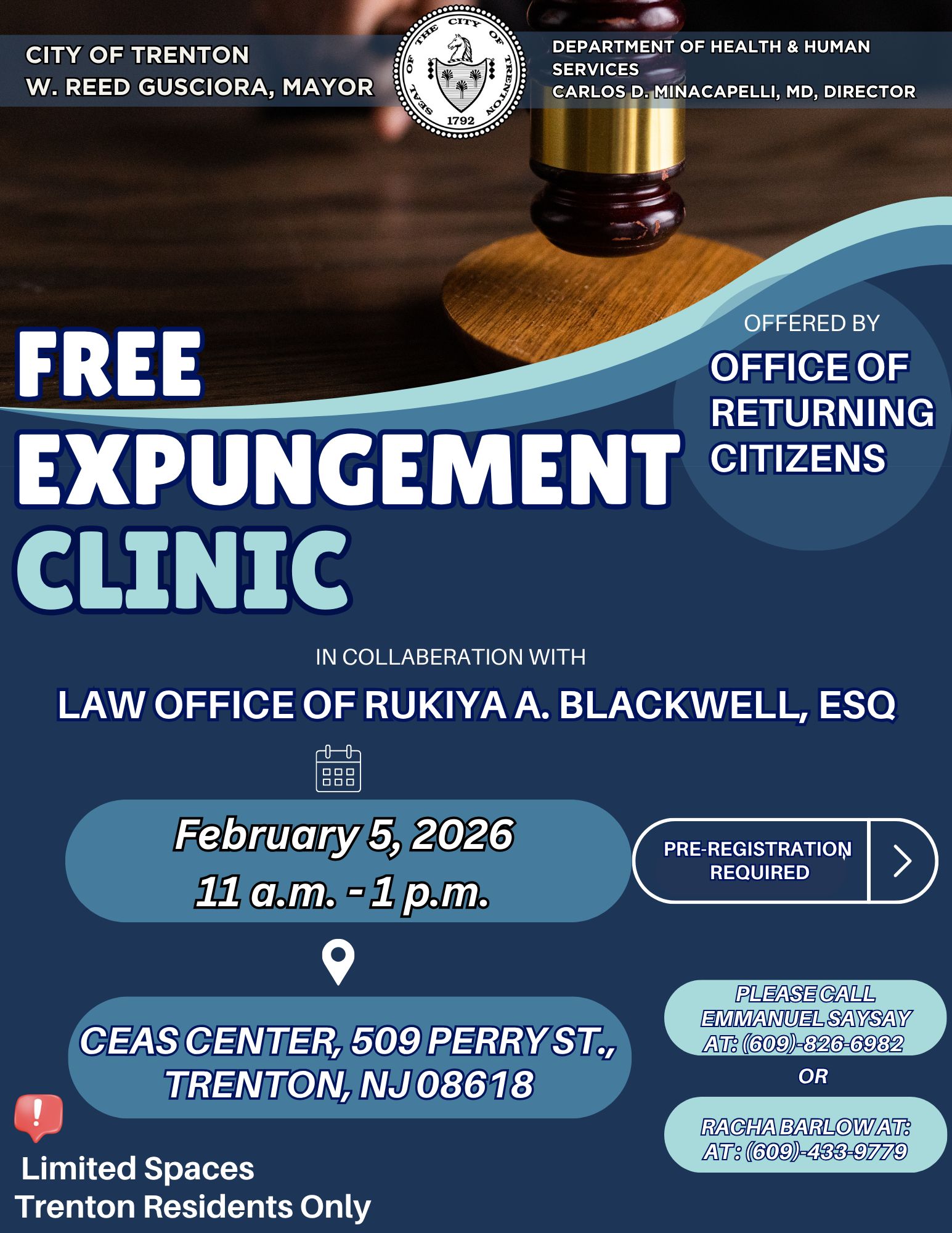 Free Expungement Clinic for Trenton Residents ONLY (City of Trenton, Office of Returning Citizens). [Thursday, February 5, 11-1pm] CEAS Center, 509 Perry Street. Contact Emmanuel Saysay at 609-826-6982 or Racha Barlow at 609-433-9779. See the Flier
