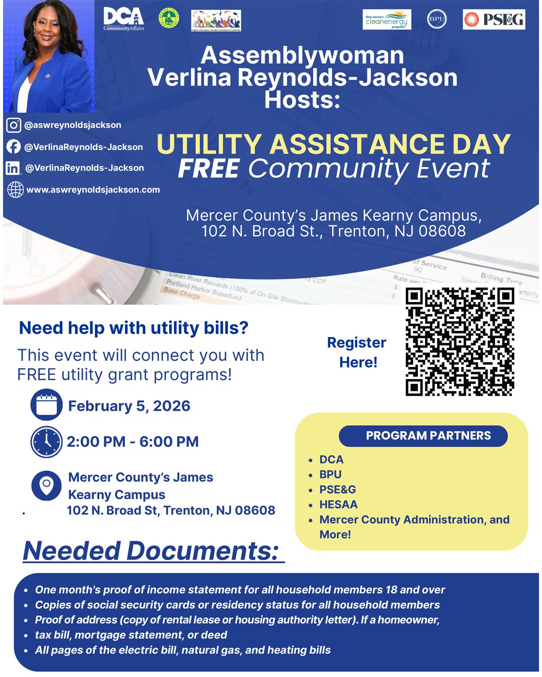 FREE Utility Assistance Day! (Hosted by Assemblywoman Verlina Reynolds-Jackson). [Thursday, February 5, 2-6pm] Mercer County Community College, James Kerney Campus, 102 North Broad Street, Trenton. See the Flier Register to Attend