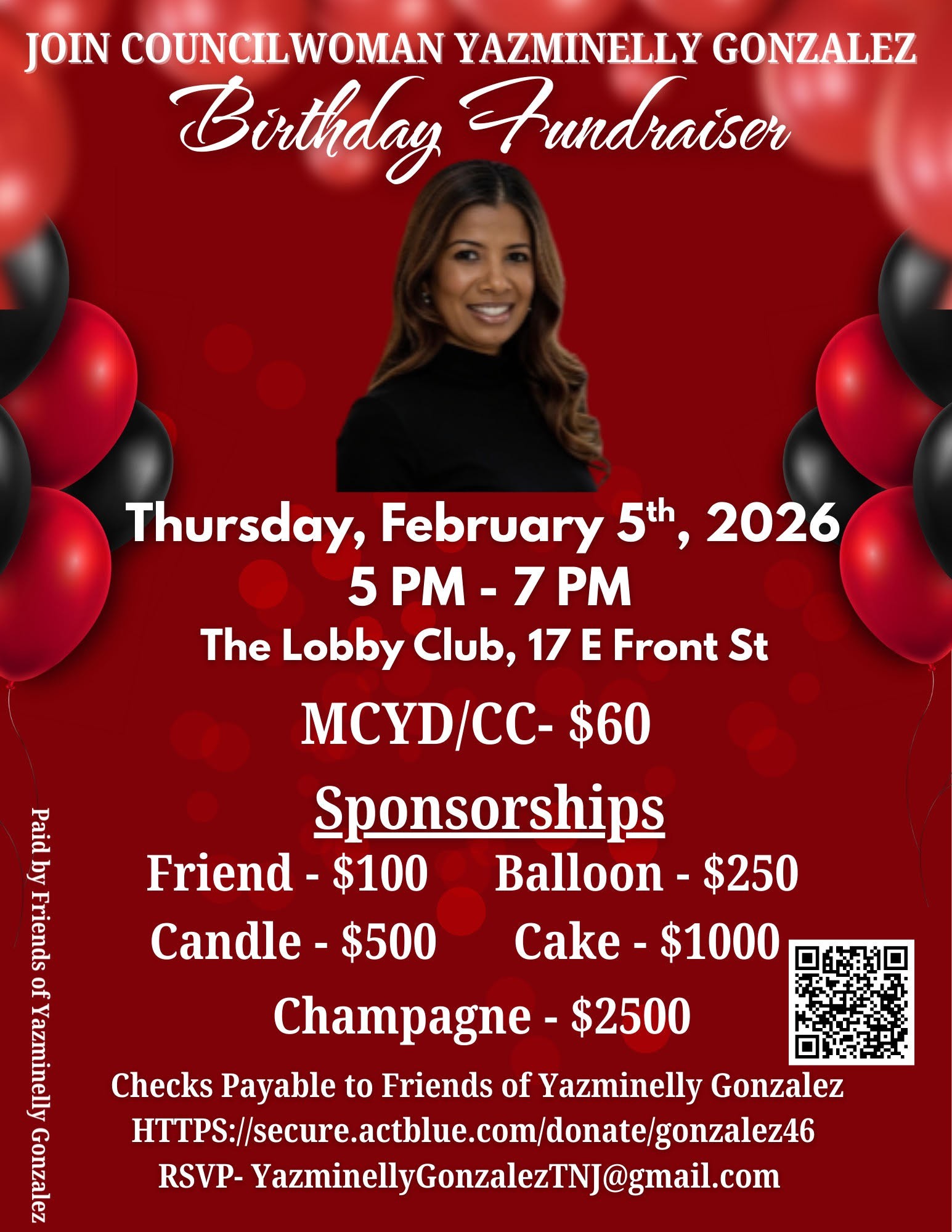 Councilwoman Yazminelly Gonzalez Birthday Fundraiser. [Thursday, February 5, 5-7pm] The Lobby Club, 17 East front Street, Trenton. See the Flier. Attendance Details. See the Flier Attendance Details
