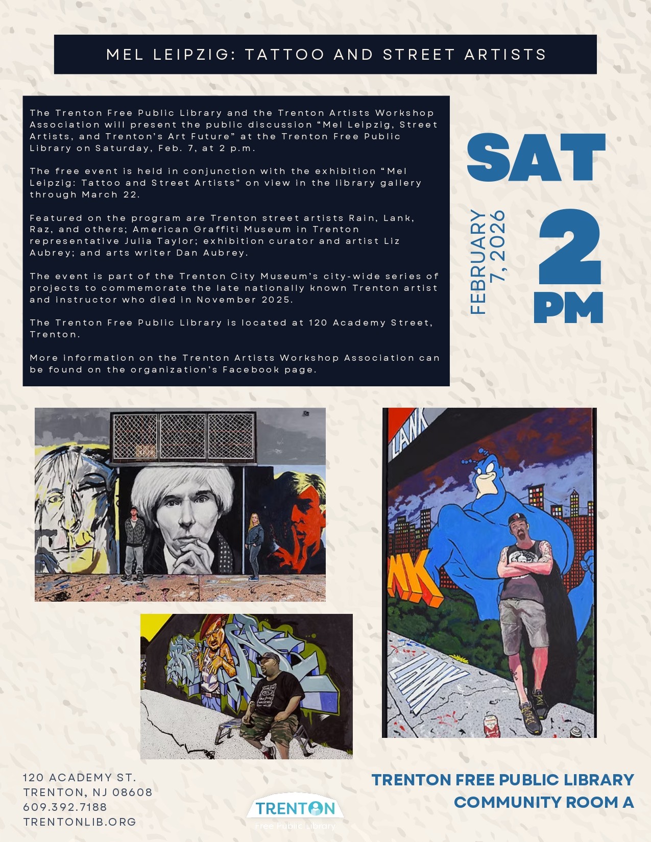 Mel Leipzig: Tattoo and Street Artists. [Saturday, February 7, 2pm] Trenton Free Public Library, Community Room A, 120 Academy Street, Trenton. See the Flier