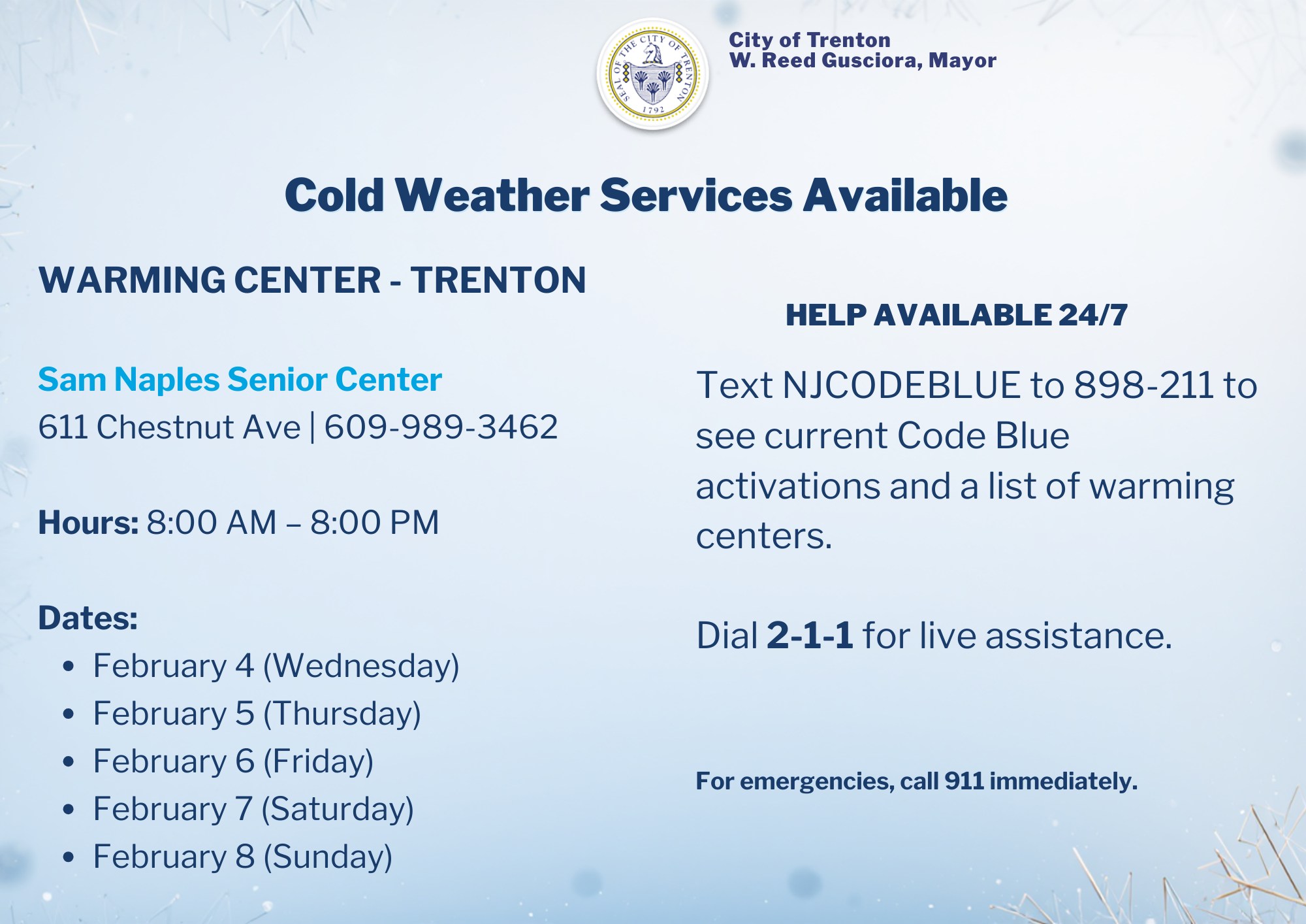 COLD WEATHER SERVICES AVAILABLE - Trenton Warming Center and 24 hour support. [Now through to February 8] See the Details