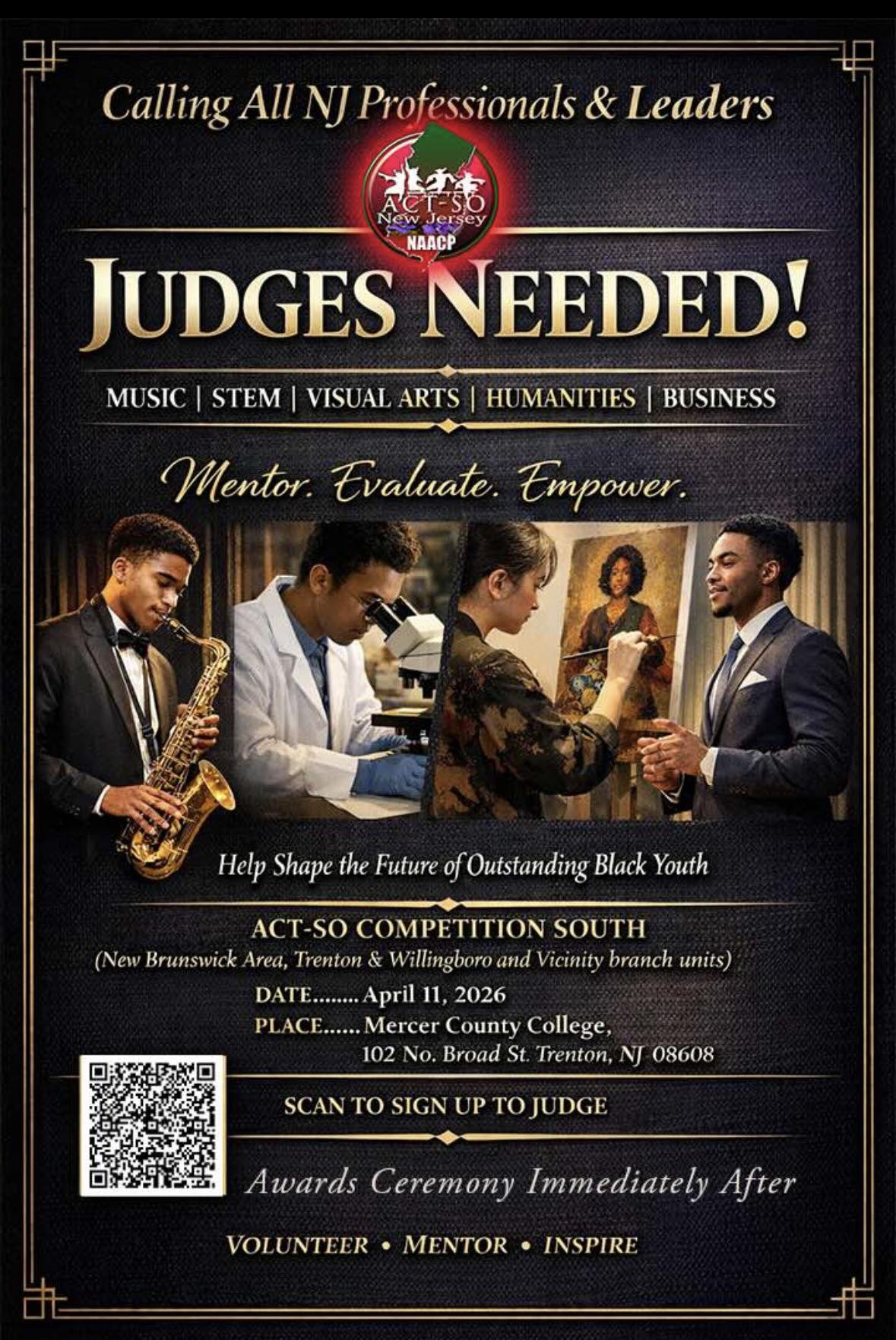 Judges Needed for the NAACP ACT-SO Competition - calling all NJ Professionals and Leaders. [Apply now, competition is on April 11] Competition location is at MCCC James Kerney Campus, 102 North Broad Street, Trenton. ACT-SO Judges are required to be degreed professionals or employed in the category they judge. See the Flier Apply to be a Judge