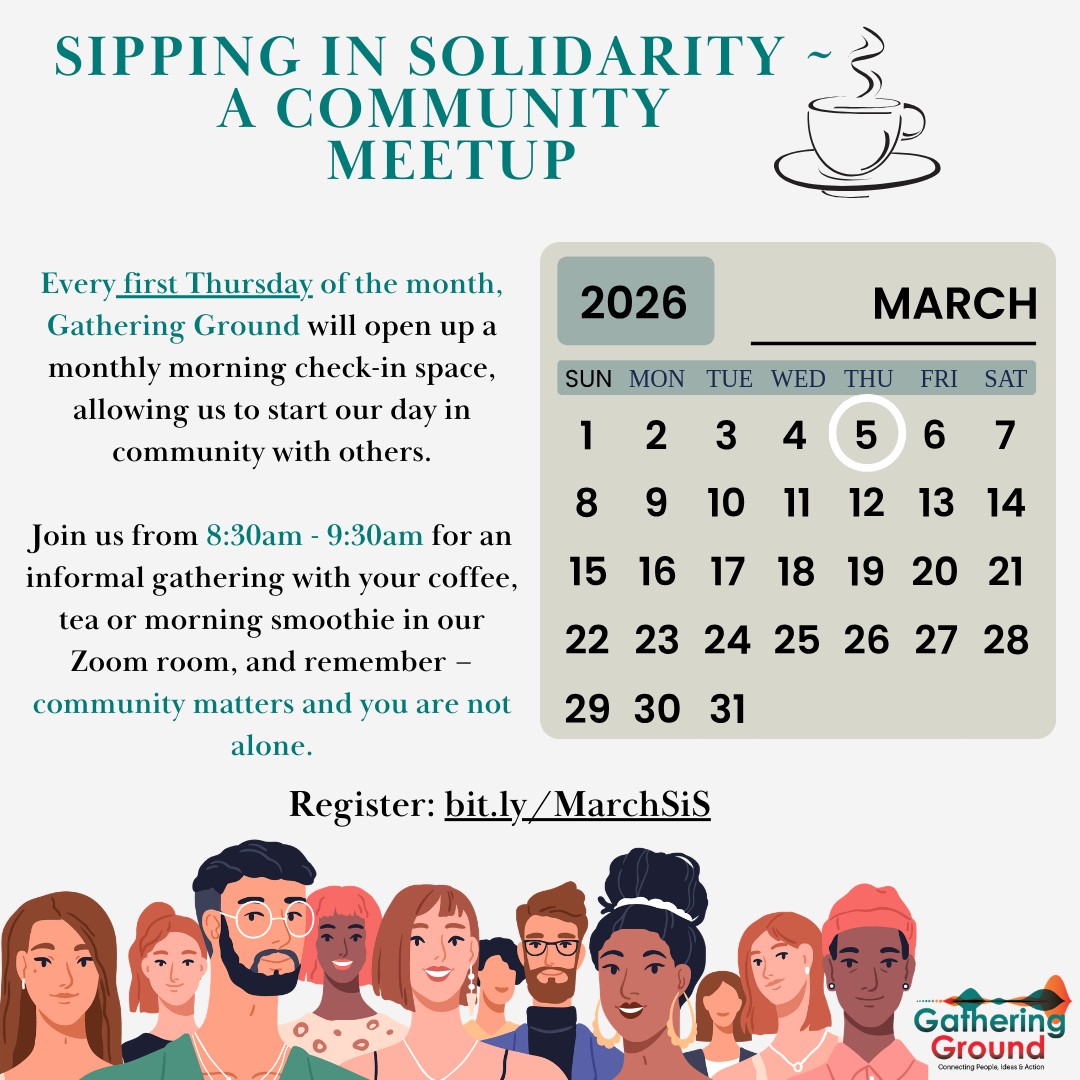 Sipping in Solidarity (a Gathering Ground virtual Community Meetup). [Thursday, March 5, 8:30-9:15am] Sipping in Solidarity is an informal morning check-in space for the Gathering Ground community to ground in with others before starting your day. Bring your own coffee, tea or morning smoothie to our Zoom room, and remember - community matters and you are not alone. See the Flier Details and RSVP