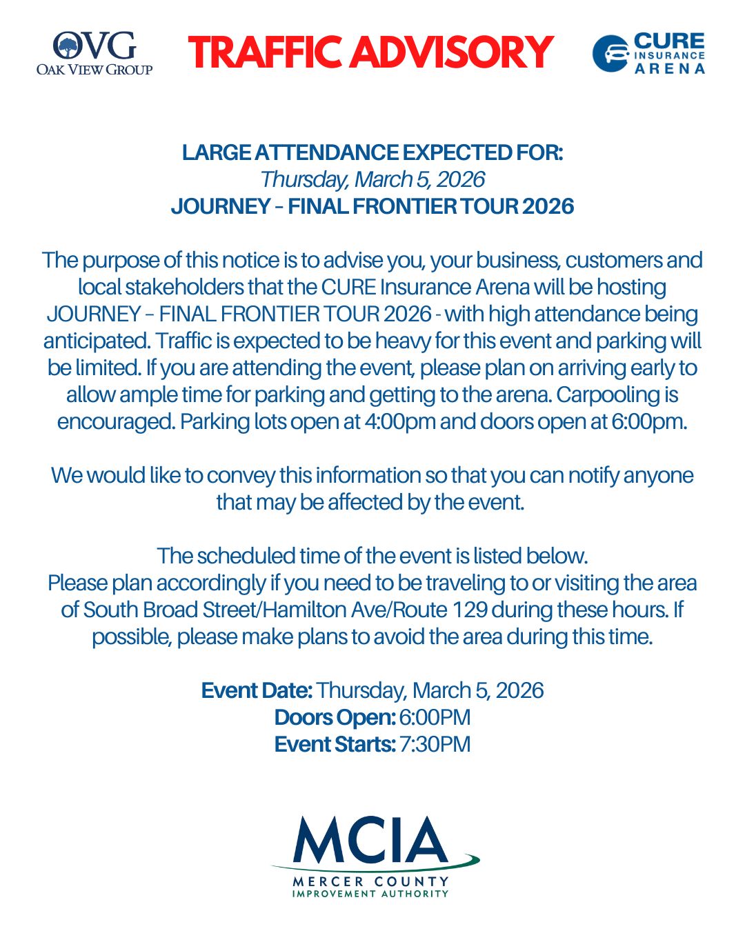 TRAFFIC ADVISORY - Large Attendance Expected at CURE Insurance Arena for the JOURNEY - Final Frontier Tour. [Thursday, March 5] The area around the CURE Insurance Arena. TRAFFIC ADVISORY - Thursday, March 5, 2026. Please avoid the immediate area after 4pm if at all possible. See the Flier