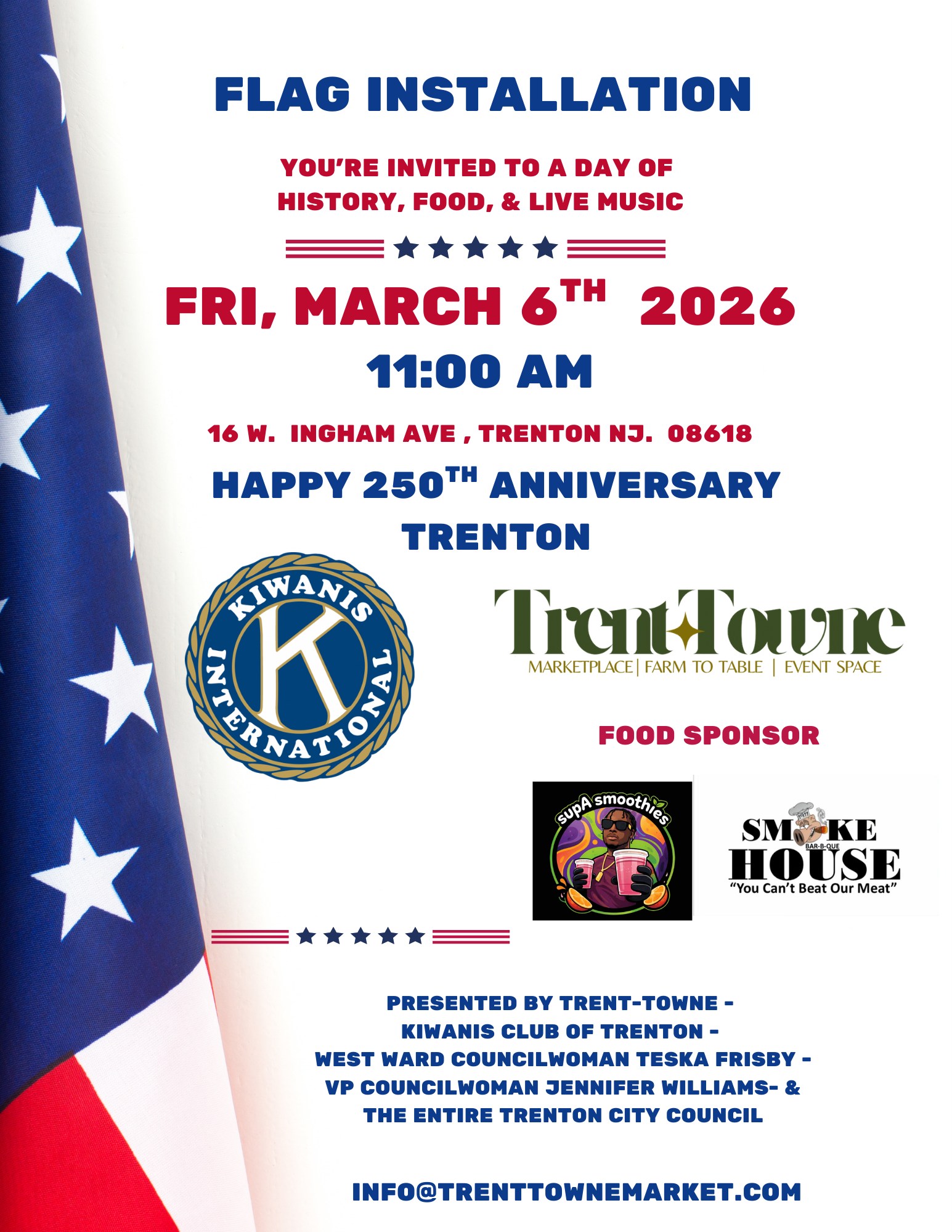Flag Installation - Happy 250th Anniversary Trenton. [Friday, March 6, 11am] Trent-Towne, 16 West Ingham Avenue, Trenton. The Kiwanis Club of Trenton, Trent-Towne Market and Trenton City Council members are collaborating to kick off the Kiwanis’ campaign to help the capital city celebrate "250 Flags for 250 Years." A day of History, Food and Live Music. See the Flier