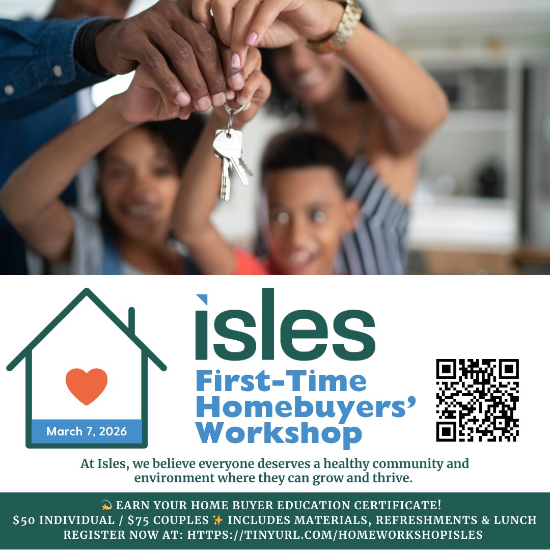 Isles First-Time Homebuyers' Workshop. [Sign-up now, workshop is on March 7, 8:45 to 4pm] Isles, 33 Tucker Steet, Trenton. Ready to make your dream of homeownership a reality? Earn your Home Buyer Education Certificate! See the Flier Register to Attend