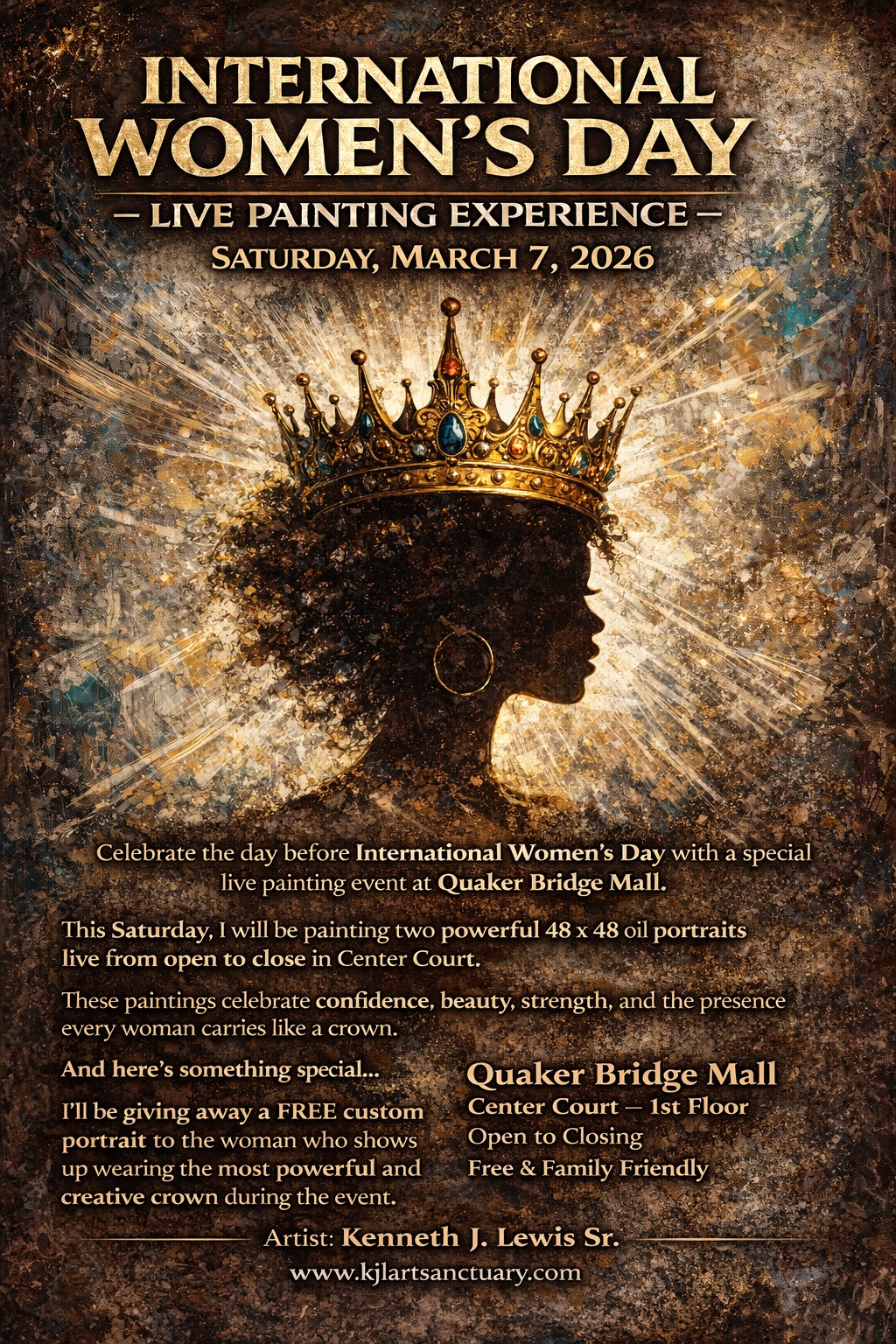 International Women's Day - Live Painting Experience. [Saturday, March 7, all day] Quaker Bridge Mall – Center Court. I’ll be creating two powerful 48 x 48 oil portraits live from open to close in Center Court. These large-scale works celebrate confidence, beauty, strength, and the presence every woman carries like a crown. See the Flier
