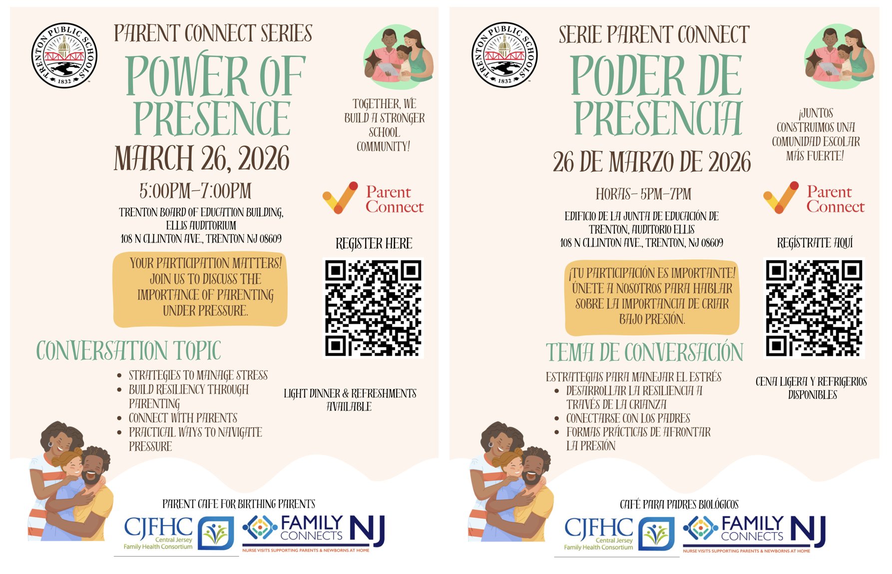 The Power of Presence / El Poder de estar Presente (Trenton Public Schools, Parent Connect Series). [Saturday, March 7 Sábado 7 de marzo, 5-7pm] Trenton Board of Education Building, Ellis Auditorium, 108 North Clinton Avenue. Families will come together to talk about managing stress, building resilience through parenting, and navigating everyday pressures. Light dinner and refreshments will be provided. in English and Spanish / en inglés y español Register to Attend