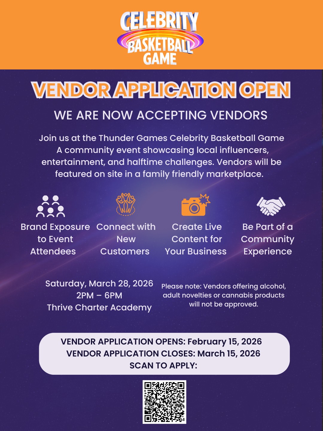 Celebrity Basketball Game - Vendor Applications. [Apply now, the celebrity game is on March 28] Thrive Charter School, 175 Leonard Avenue, Hamilton. Want to be part of the action at this year’s Celebrity Basketball Game? Our vendor application is officially LIVE! Showcase your products, connect with the community, and join us courtside for an unforgettable event. See the Flier Vendor Application