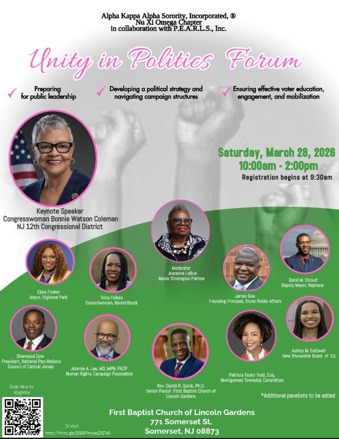 Unity in Politics Forum (Alpha Kappa Alpha Sorority, Inc, Nu Xi Omega Chapter in collaboration with P.E.A.R.L.S., Inc.). [Saturday, March 28, 10-2pm] First Baptist Church of Lincoln Gardens, 771 Somerset Street, Somerset, NJ. Whether you’re considering running for office, working on a campaign, or looking to deepen your civic engagement — this event is for YOU! See the Flier Registration