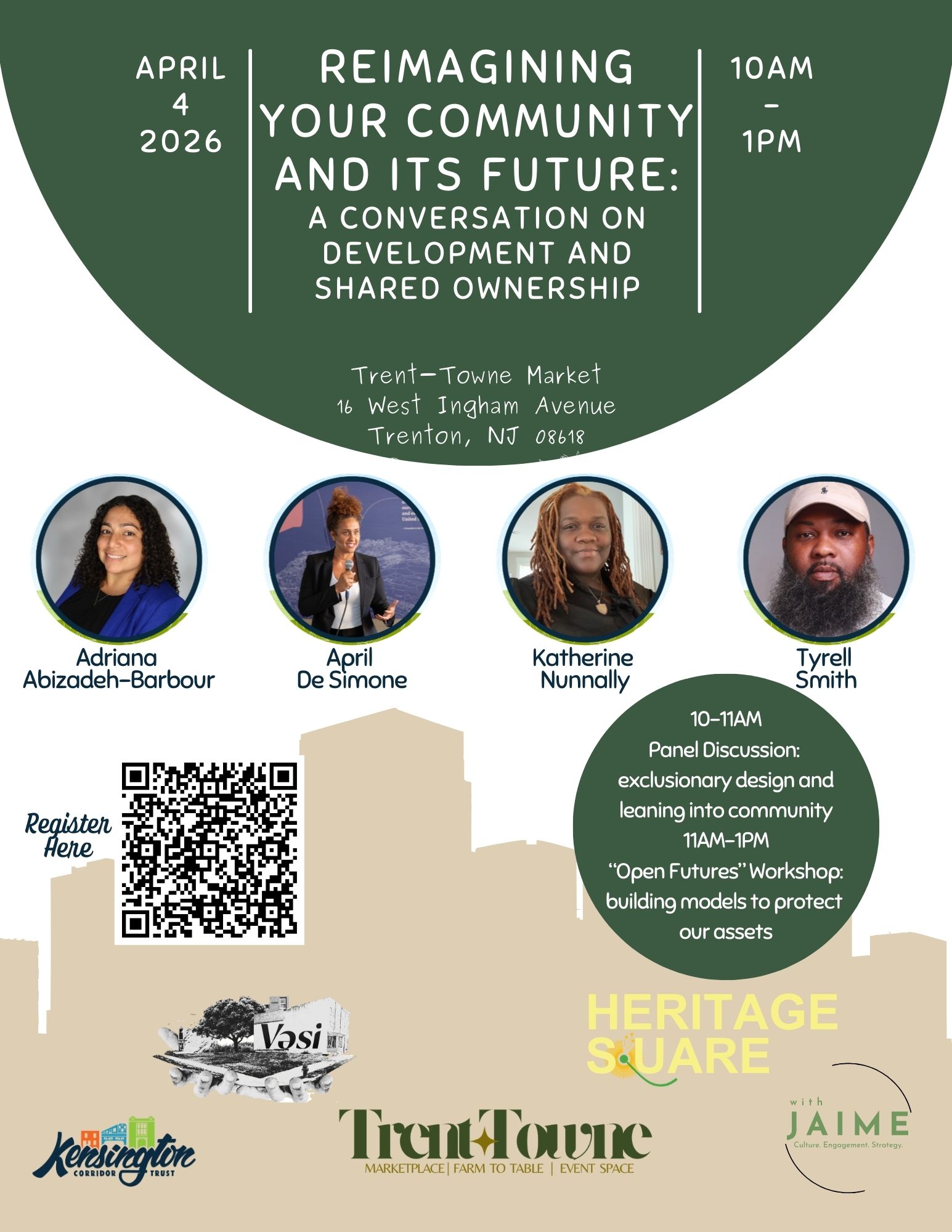 Reimagining Your Community and Its Future. [Saturday, April 4, 10-1pm] Trent-Towne Market, 16 West Ingham Avenue, Trenton. Join us for an in-depth discussion about development and shared ownership, and explore how leaning into the power of community can help us build what we want to see. Immediately following the panel, we will have a workshop focused on building models that help us protect the areas we call home. See the Flier Register to Attend