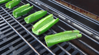 Since Trader Joe's only sells certain items in bulk (I only wanted 2 jalapenos but managed to walk away with 10), I needed to come up with something to do with all of the leftovers and grilled jalapenos seemed like the BEST option. After washing, de-seeding and slicing the penos in half, I threw them on the top rack of the grill for a couple minutes each side.
