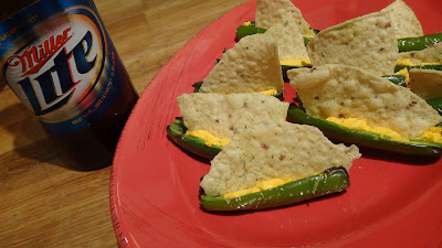 After pulling them off and allowing them to cool a little, I filled the inside with some Merkts Cheese (please don't judge me because I put spreadable cheese on everything). The only trouble with this process is that putting the cheese in the jalapeno is similar to putting peanut butter in celery. Slippery little suckers. So, make sure you scrape the knife sideways, otherwise, it will just keep gliding out. Once the penos are stuffed, I top them off with some tortillas chips (one full chip will do but I've also used the crunched up bits in the bottom of the bag). The chips not only function as a handle but they make these grilled jalapenos taste just like the ballpark nachos that we love so much.